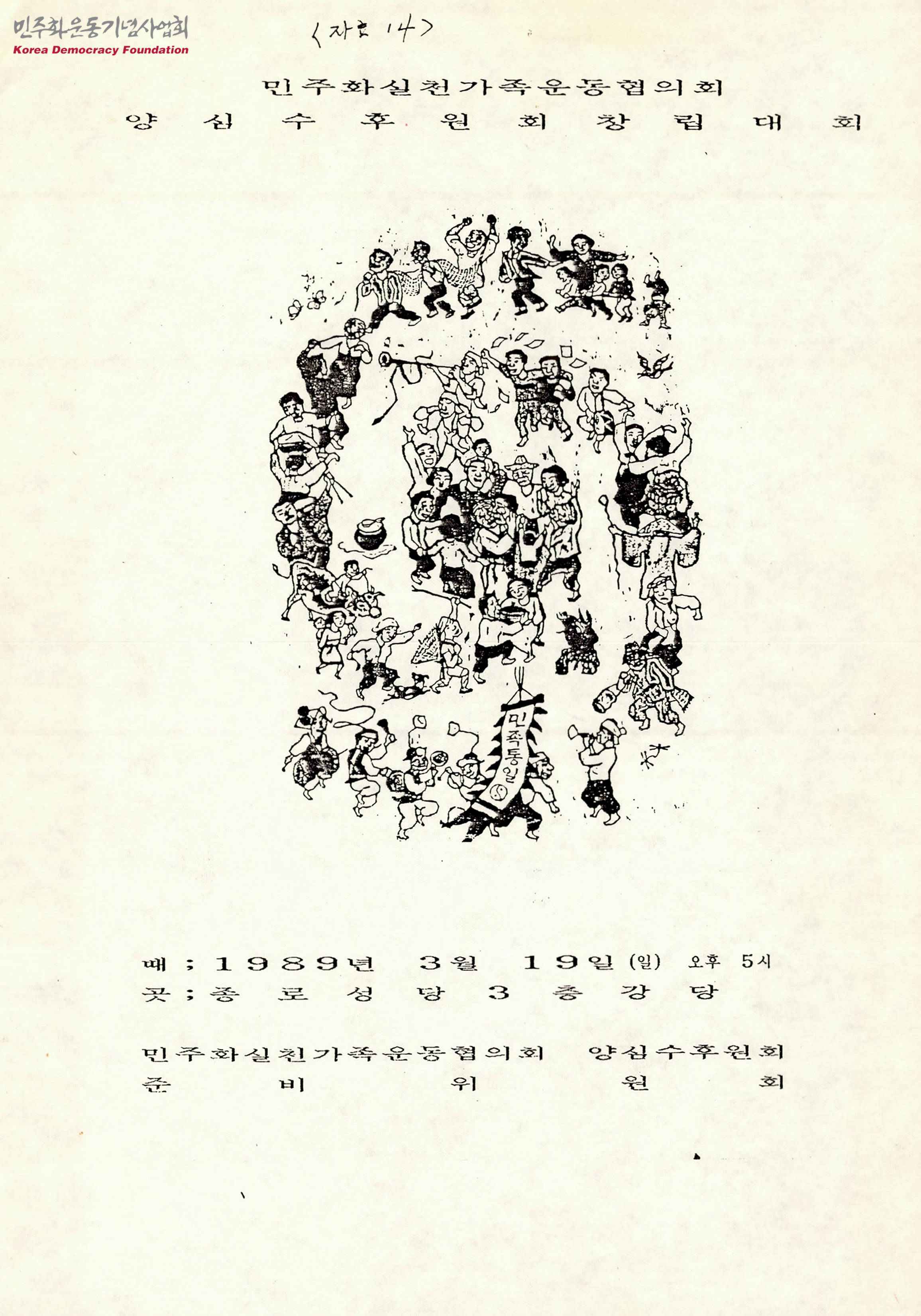 - 1989년 3월 19일 종로성당 3층 강당에서 열린 민주화실천가족운동협의회 양심수후원회 창립대회 안내문으로 '식순', '양심수후원회 회칙(가안)', '준비위원회 활동보고', '창립선언문', '양심수후원회 발기회원' 등의 내용이 수록되어 있음