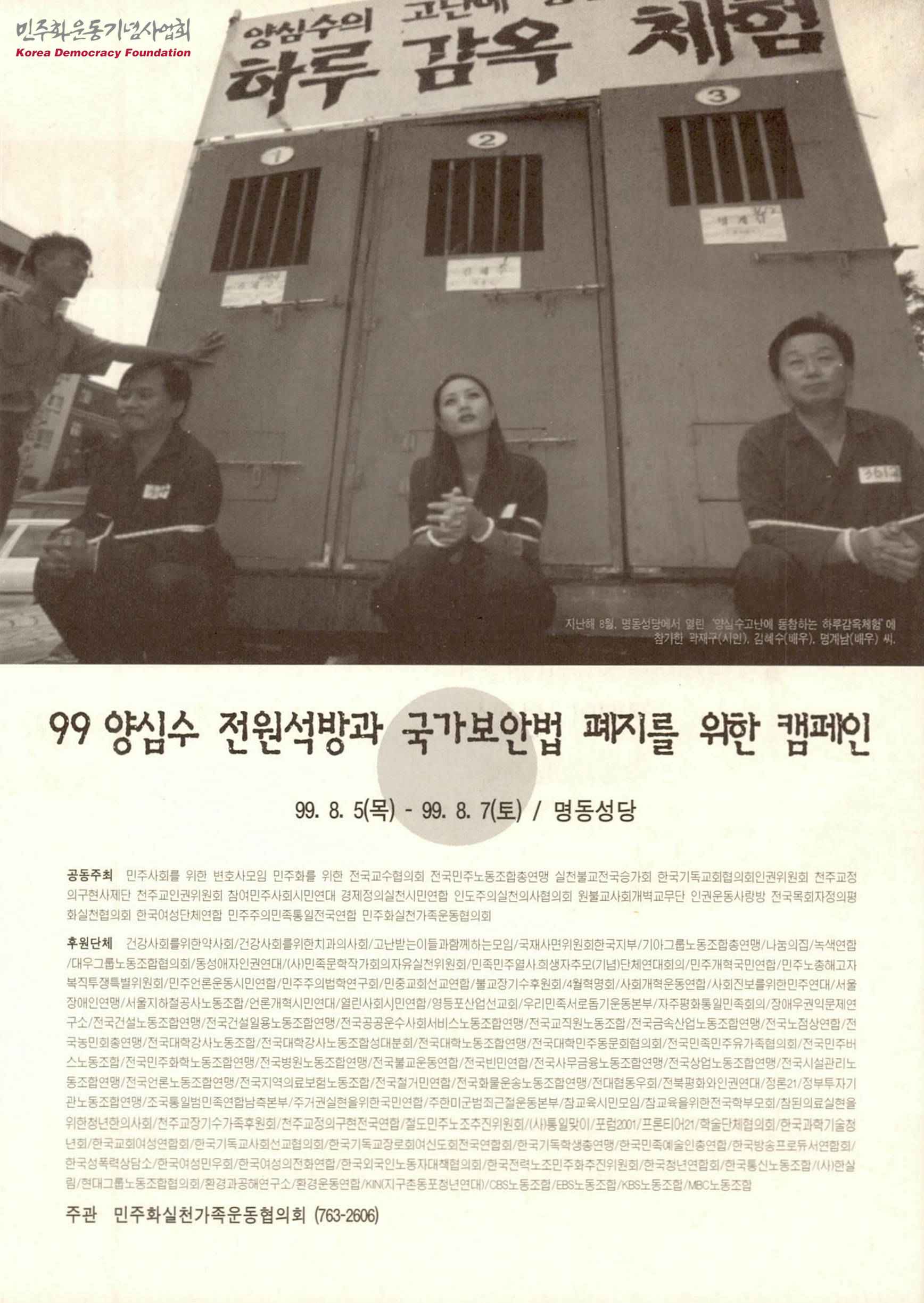 - 1999년 8월 5일부터 8월 7일까지 명동성당에서 열린 99 양심수 전원 석방과 국가보안법 폐지를 위한 캠페인의 안내문으로 '하루 감옥체험', '캠페인 선포식', '목요집회', '99 인권 우드스탁', '시민가요제', '아주 작은 인권 만화전' 등의 행사가 수록되어 있음