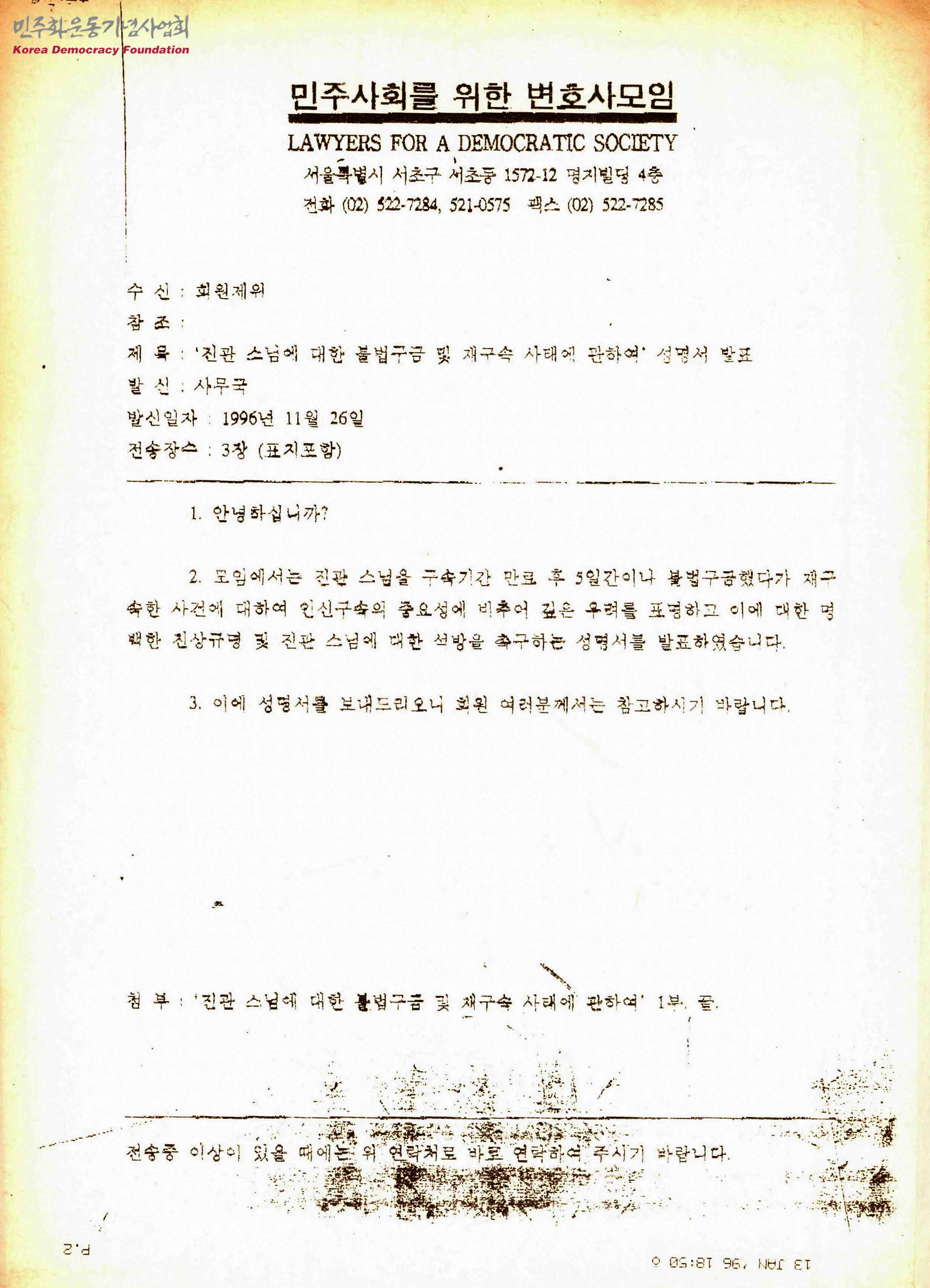 - 민주사회를 위한 변호사모임의 '진관스님에 대한 불법구금 및 재구속 사태에 관하여'라는 제목의 성명서 발표와 성명서를 회원들에게 보낸다고 알리고 있으며 '진관스님에 대한 불법구금 및 재구속 사태에 관하여' 1부를 첨부하고 있음