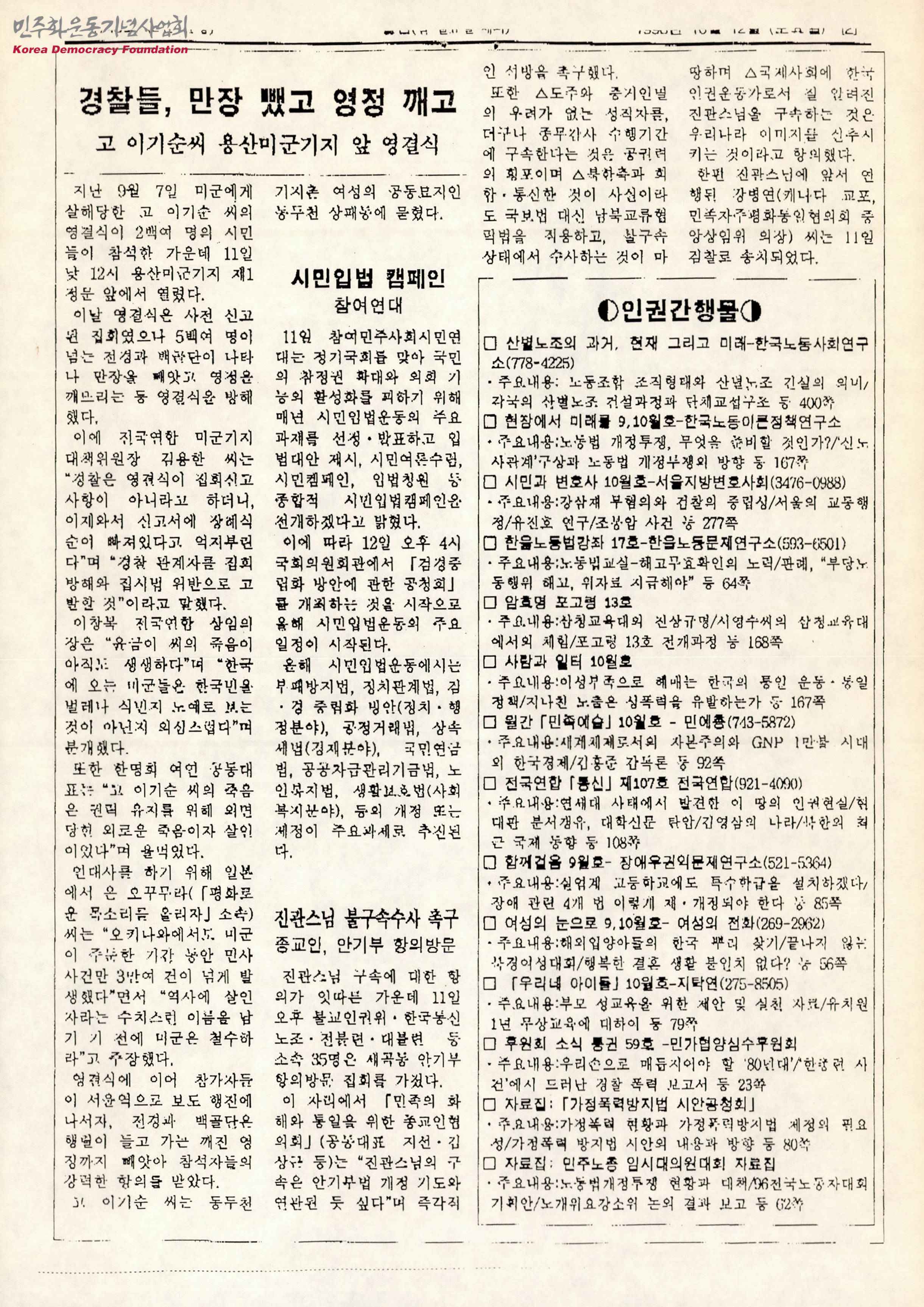 - 인권운동 사랑방에서 발행한 1996년 10월 12일 자 인권하루소식 제743호로 '경찰들, 만장 뺏고 영정 깨고', '시민입법 캠페인 참여연대', '진관스님 불구속 수사 촉구' 등의 내용이 수록되어 있음