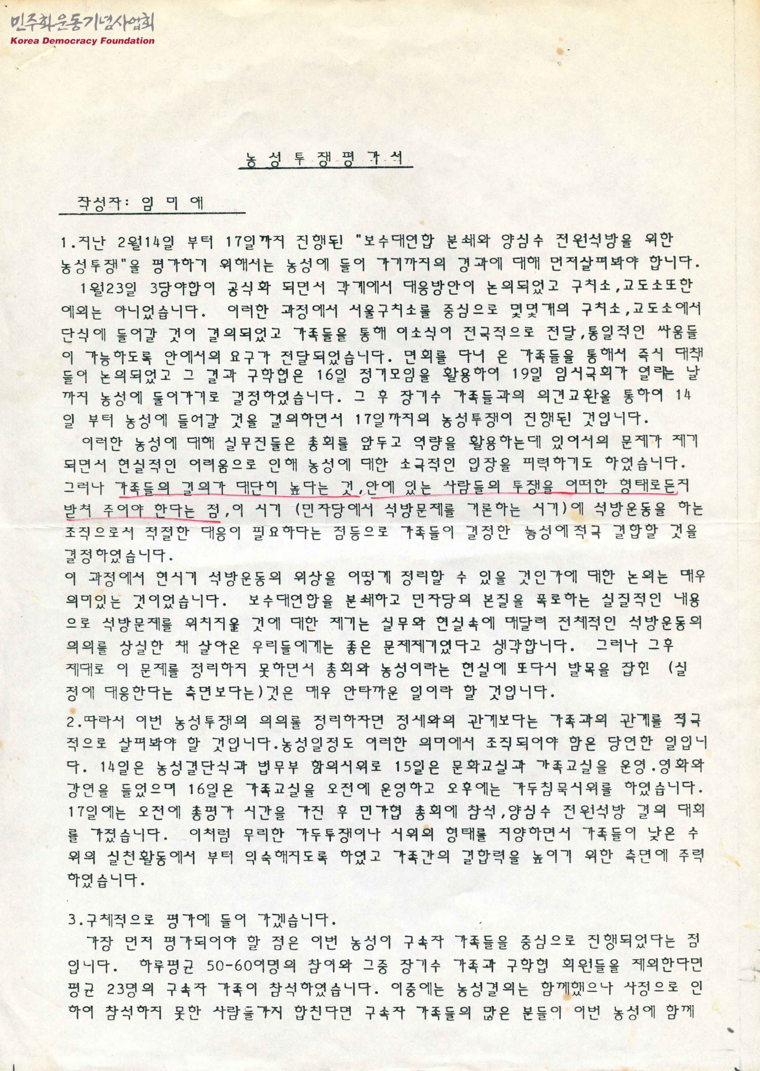 - 3당야합에 대한 반발을 다룬 "보수대연합 분쇄와 양심수 전원석방을 위한 농성투쟁"의 평가서로, 다음과 같은 내용 등을 다룸 1. 농성에 들어가기까지의 경과 2. 가족과의 관계 중심으로 본 이번 농성투쟁의 의의 3. 구체적 평가 4. 반성하고 생각해 보아야 할 점들