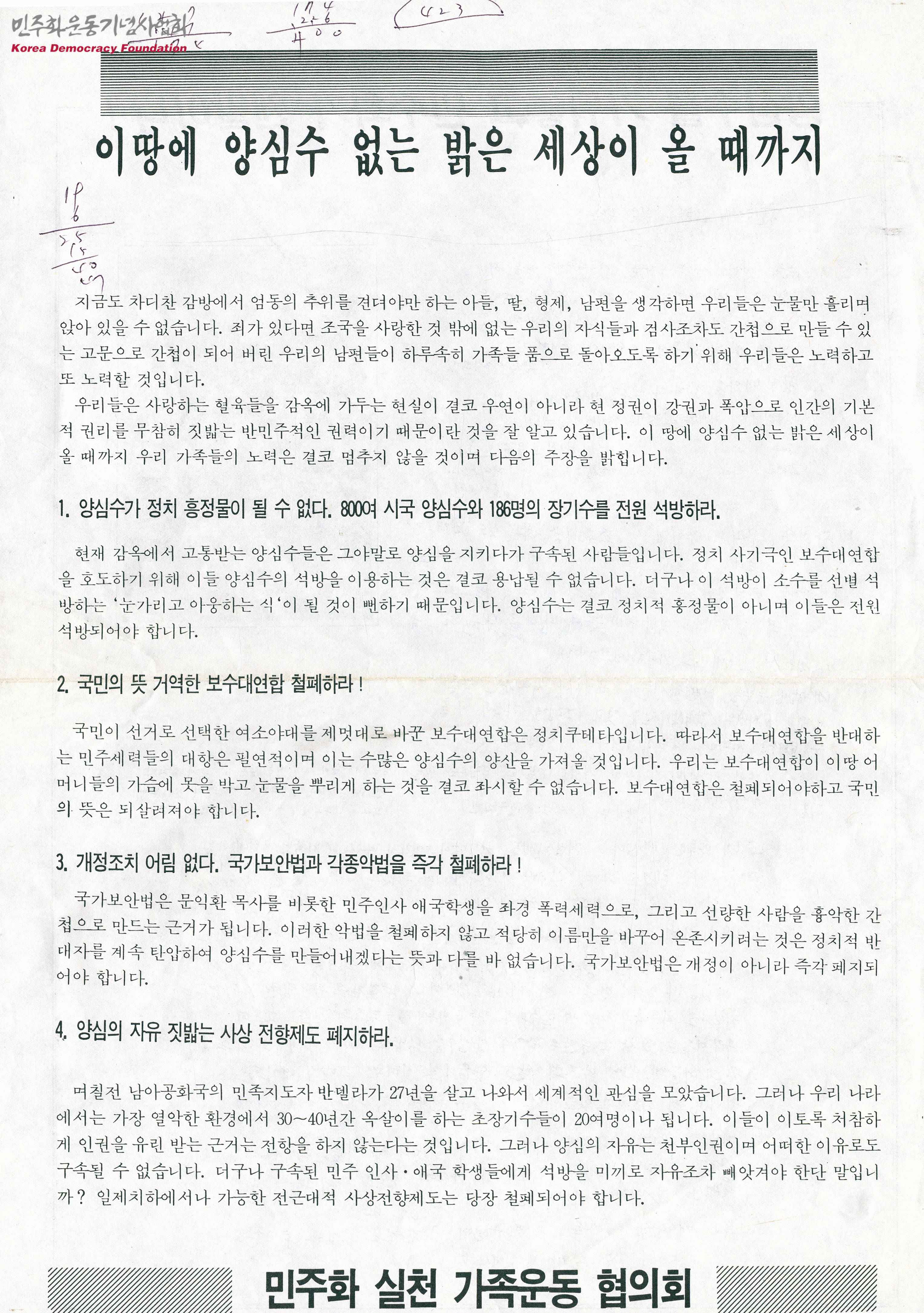 - 양심수 및 장기수 전원 석방, 보수대연합 철폐, 국가보안법과 각종 악법 즉각 철폐, 사상 전향제도 폐지 등을 주장한 민주화 실천 가족운동 협의회의 입장문, 양심수 가족들의 자식·국민에게 하고 싶은 메시지 모음