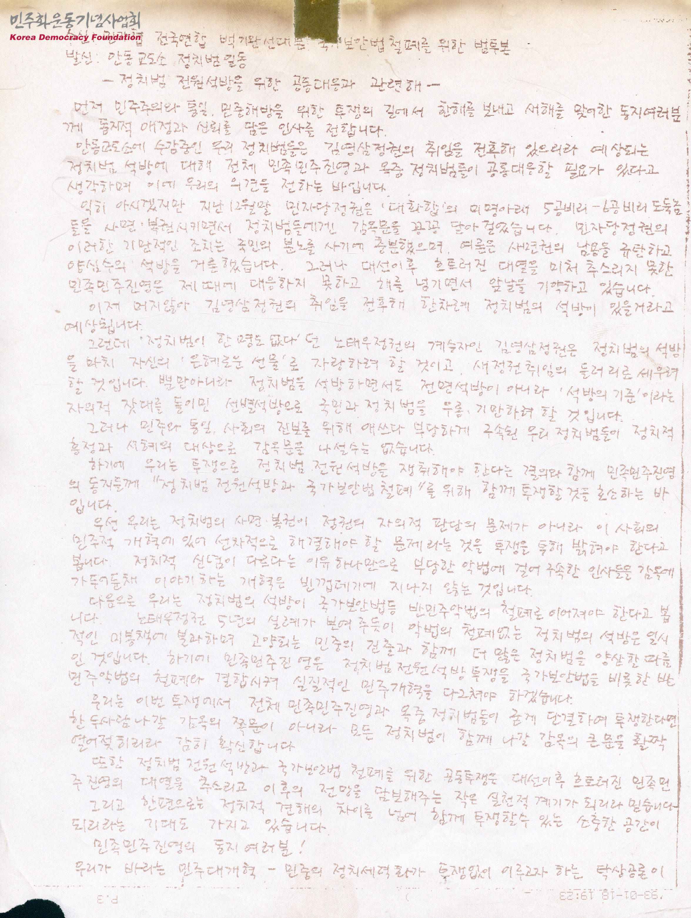 정치범 전원석방을 위한 공동대응과 관련해 [수신: 민가협 전국연합, 백기완 선대본, 국가보안법 철폐를 위한 범투본, 발신: 안동교도소 정치범 일동]