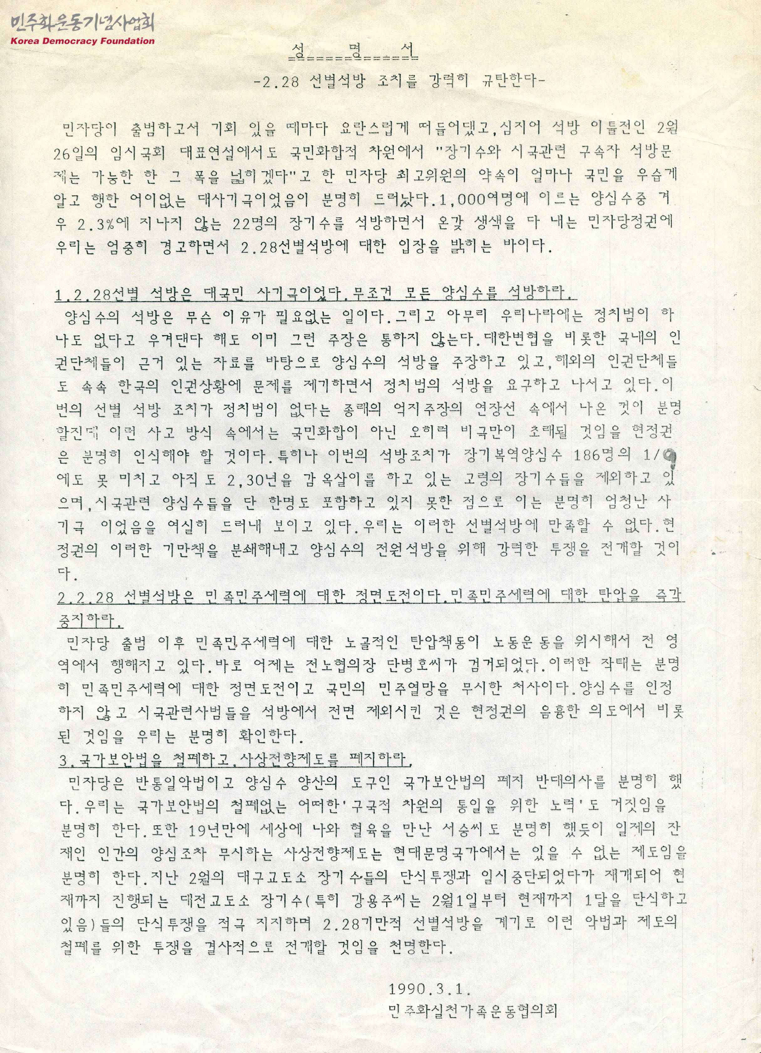 - 1000여명에 이르는 양심수 중 22명의 장기수를 석방한 민자당 정권의 2.28선별석방에 대한 규탄 성명서로, 다음과 같은 내용 등을 다룸 1. 2.28선별 석방은 대국민 사기극이었다. 무조건 모든 양심수를 석방하라. 2. 2.28 선별석방은 민족민주세력에 대한 정면도전이다. 민족민주세력에 대한 탄압을 즉각 중지하라. 3. 국가보안법을 철폐하고, 사상전향제도를 폐지하라.