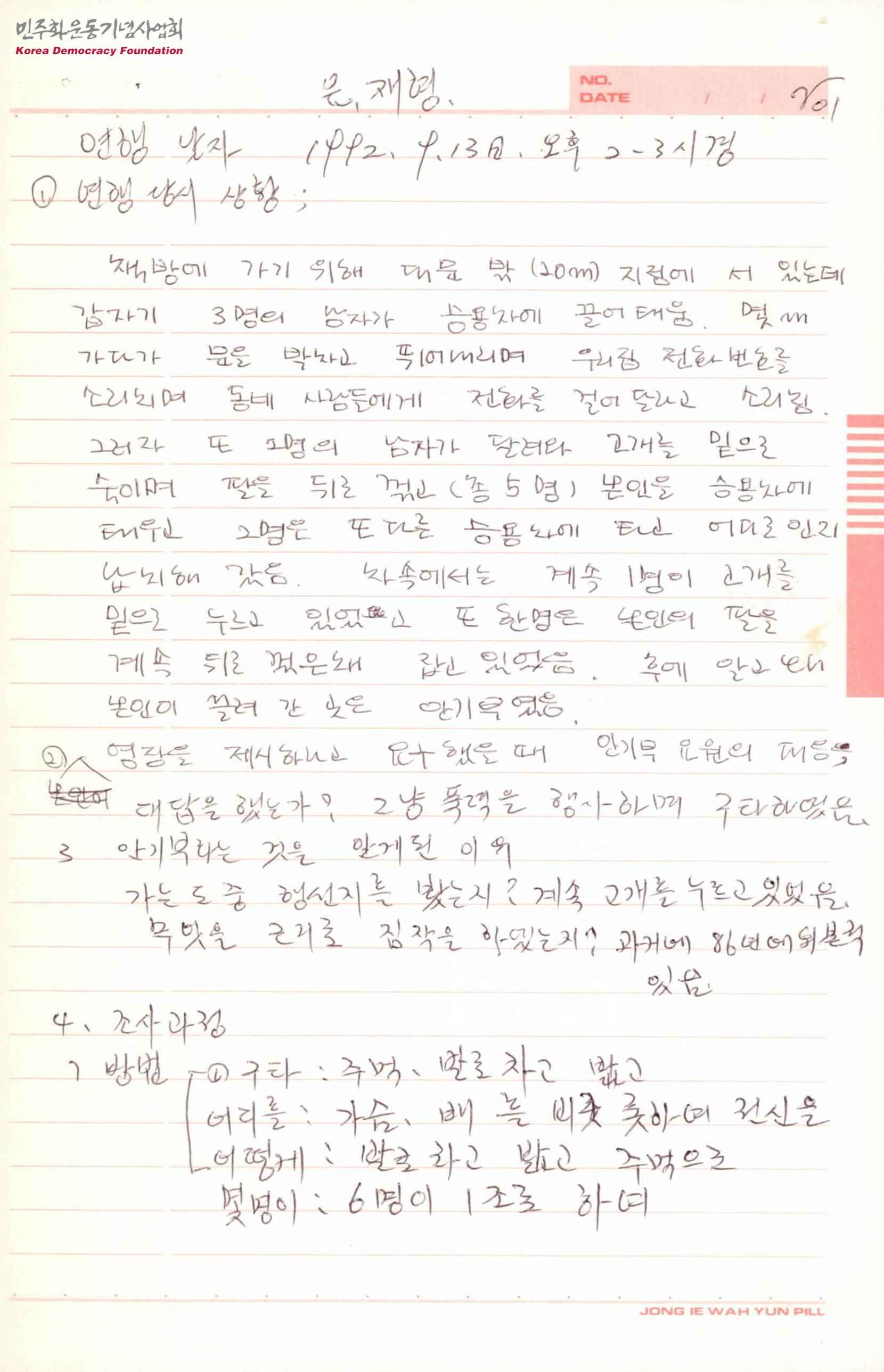 - 문재형의 연행날짜, 연행 당시 상황, 조사과정에서 구타와 잠안재우기 고문 등이 있었다는 것, 검찰조사에서도 국가안전기획부 직원이 동행했다는 것 및 주사관의 인상착의 등이 적혀있는 문서