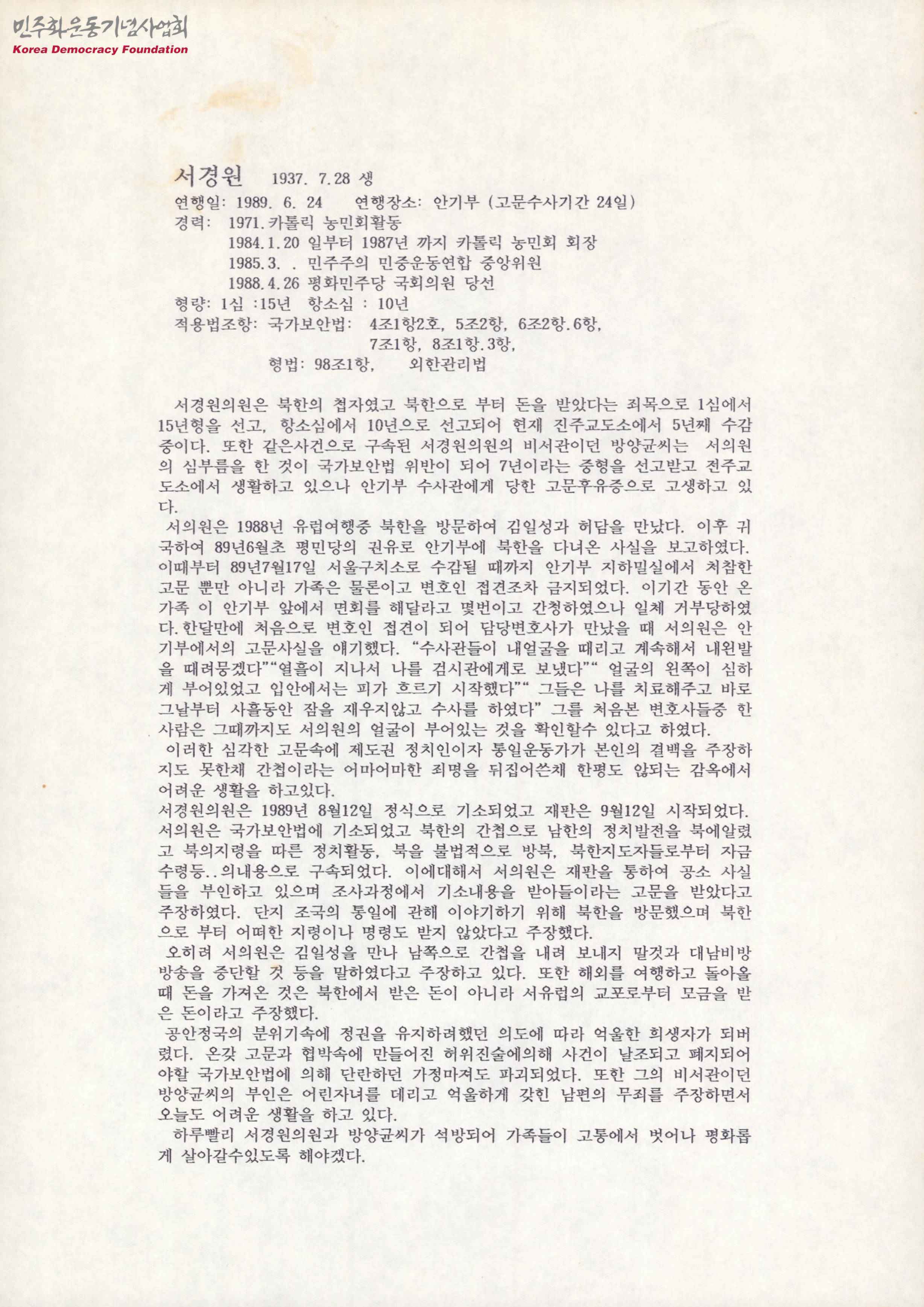 - 간첩이라는 죄목으로 국가보안법 위반이 되어 수감생활 중인 서경원에 대한 보고서로, 유럽여행 중 북한을 방문해 김일성과 허담을 만났다는 것, 국가안전기획부에 이 사실을 보고하자 지하밀실에서 고문을 받았다는 것, 공안정국의 분위기 속에 정권을 유지하려했던 의도에 따라 억울한 희생자가 되어버렸다는 것 등의 내용이 적혀있음