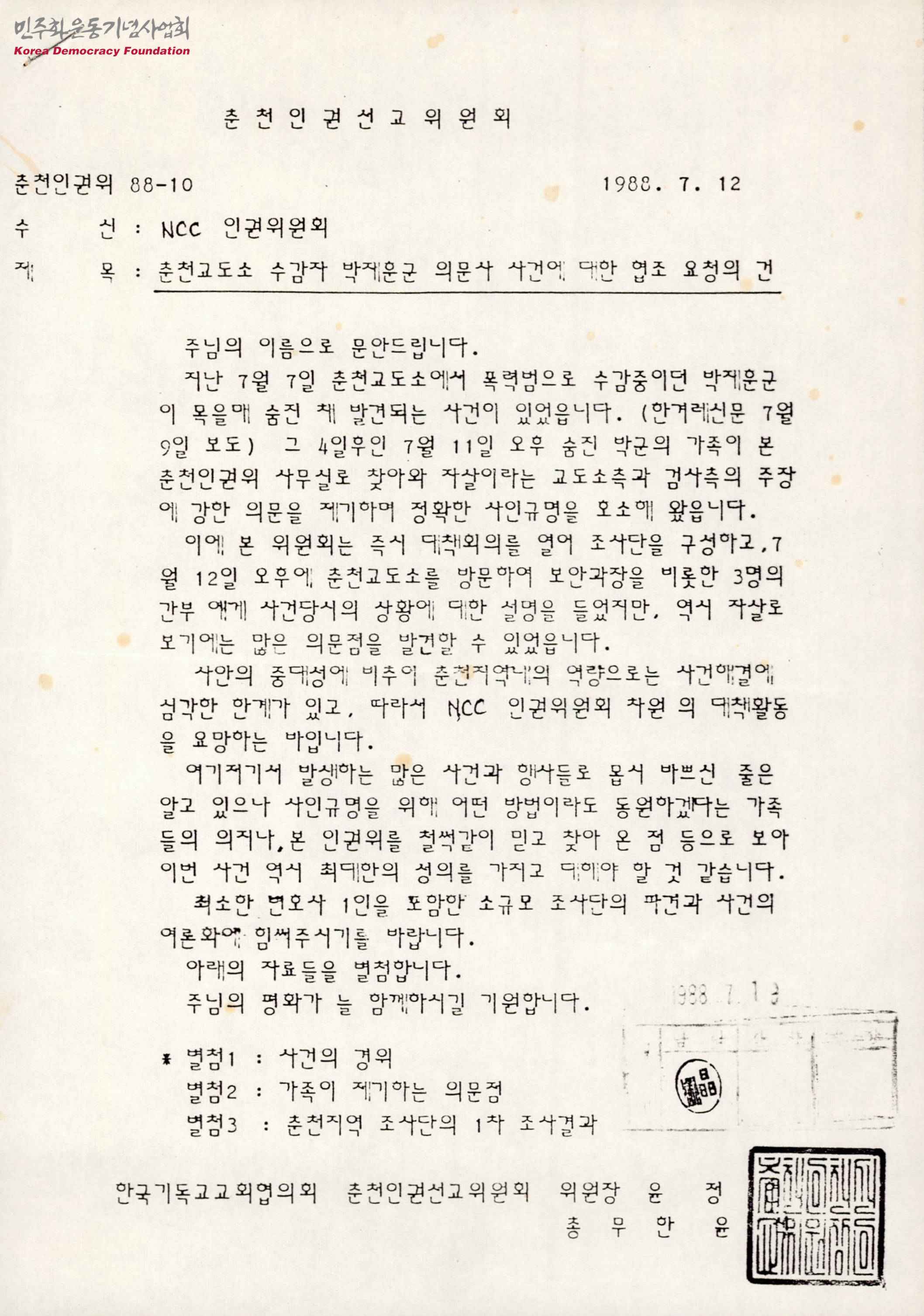 - 춘천교도소에서 폭력범으로 수감중이던 박재훈이 목을 매 숨진채 발견된 사건에 대해, 자살이라는 교도소와 검사측의 주장에 강한 의문을 제기하며 NCC 인권위원회 차원의 조사단의 파견과 사건의 여론화에 힘써주기를 부탁하는 문서로 별첨된 문서는 다음과 같음 - 사건의 경위 - 가족이 제기하는 의문점 - 춘천지역 조사단의 1차 조사결과