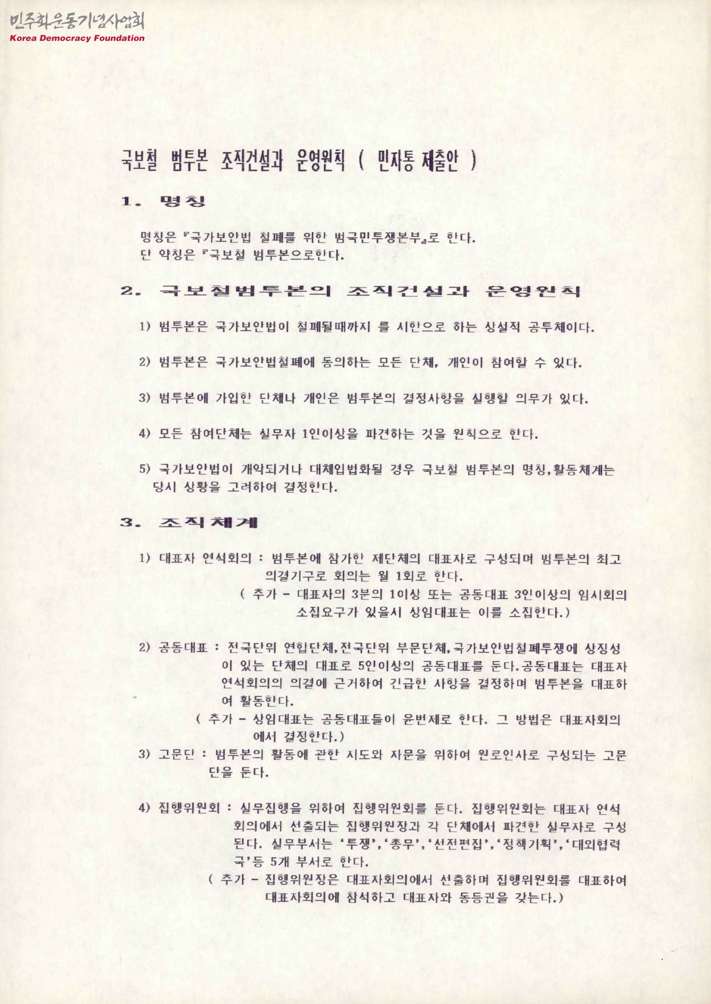 - 국가보안법 철폐를 위한 범국민 투쟁본부의 운영원칙이 적혀있는 문서로 목차는 다음과 같음 1. 명칭 2. 국보철범투본의 조직건설과 운영원칙 3. 조직체계