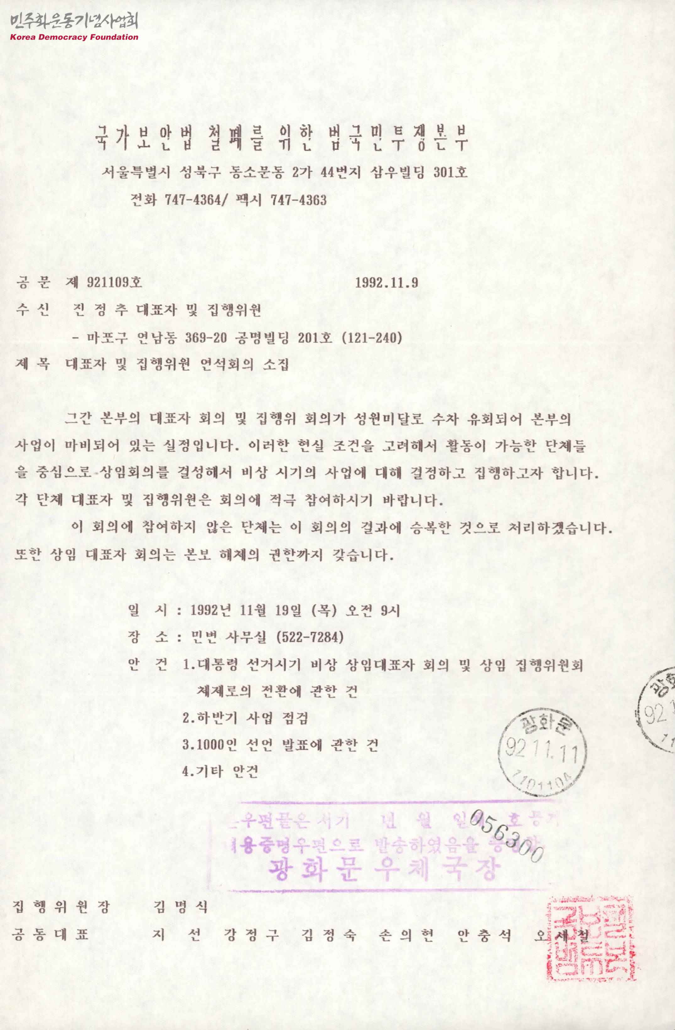 - 진보정당추진위원회 대표자 및 집행위원에게 국가보안법 철폐를 위한 범국민 투쟁본부의 회의 및 집행위 회의가 성원미달로 유회되어 본부의 사업이 마비되어 있다고 하며, 활동이 가능한 단체들 중심으로 상임회의를 결성해 비상 시기의 사업에 대해 결정하고 집행하고자 하니 참석을 요구하는 내용의 문서임