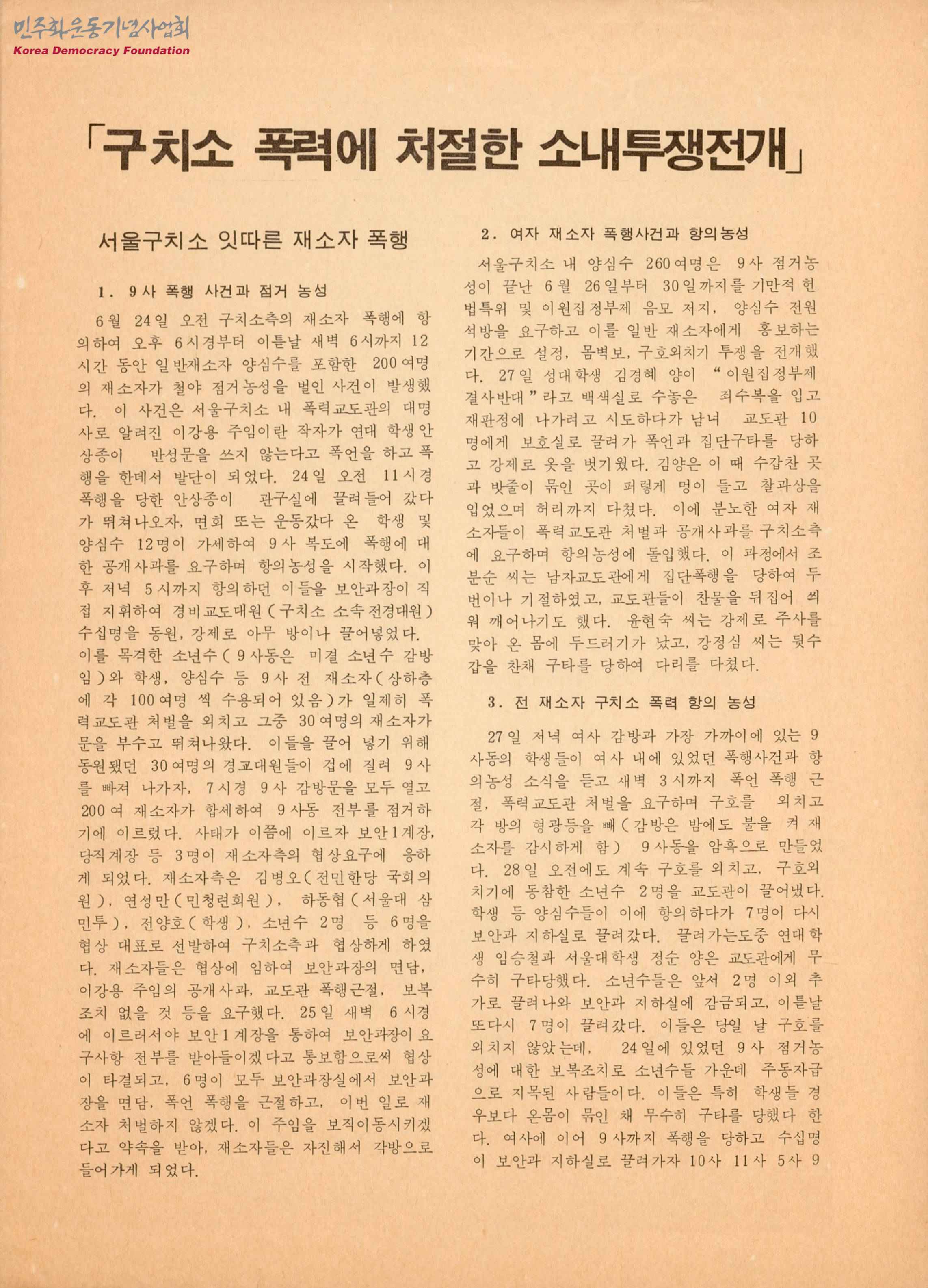 - 최근 구속학생들에 대한 폭행과 금치 등의 가혹행위를 비판하며 구치소 별 수감자들이 받은 가혹행위 내용이 적혀있고 요구내용은 다음과 같음 - 1,000여명의 양심수를 당장 석방하라 - 폭력정권 물러가라 - 형행법 개정하여 재소자 인권 보장하라 - 신민당은 구치소의 인권유린 사태에 대한 진상규명을 위해 조사위를 주성하라 - 폭력 교도관 색출하여 엄단하라