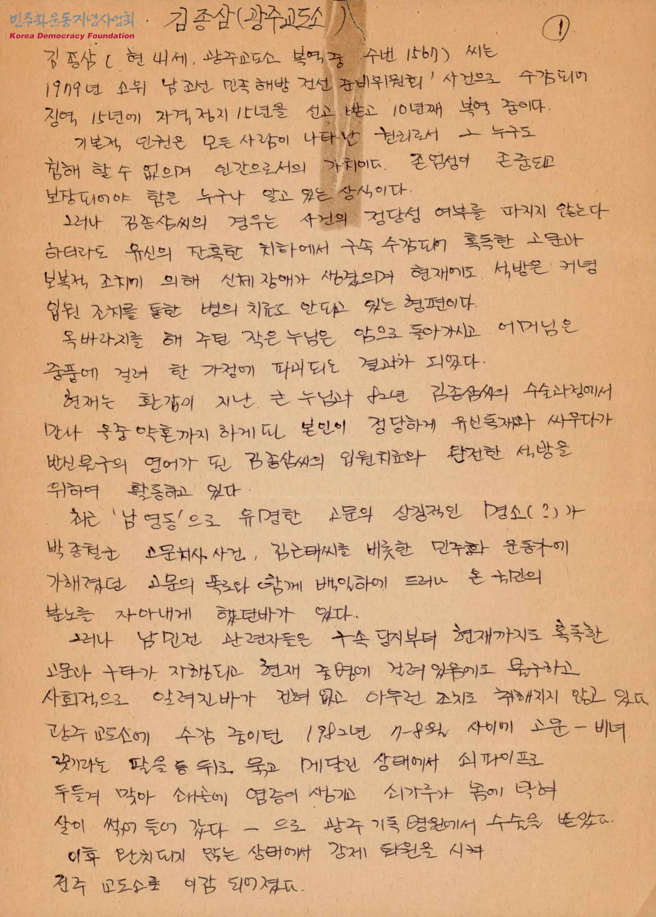 - 남조선민족해방전선준비위원회 사건으로 구속된 김종삼이 투옥 직후 수사과정에서 극악한 고문으로 지병을 얻게 되었고 제대로 된 진단과 치료를 받지 못해 더 이상의 감옥생활은 인간성의 파괴이자 죽음으로 내모는 범죄행위라며 석방을 주장하는 내용의 문서