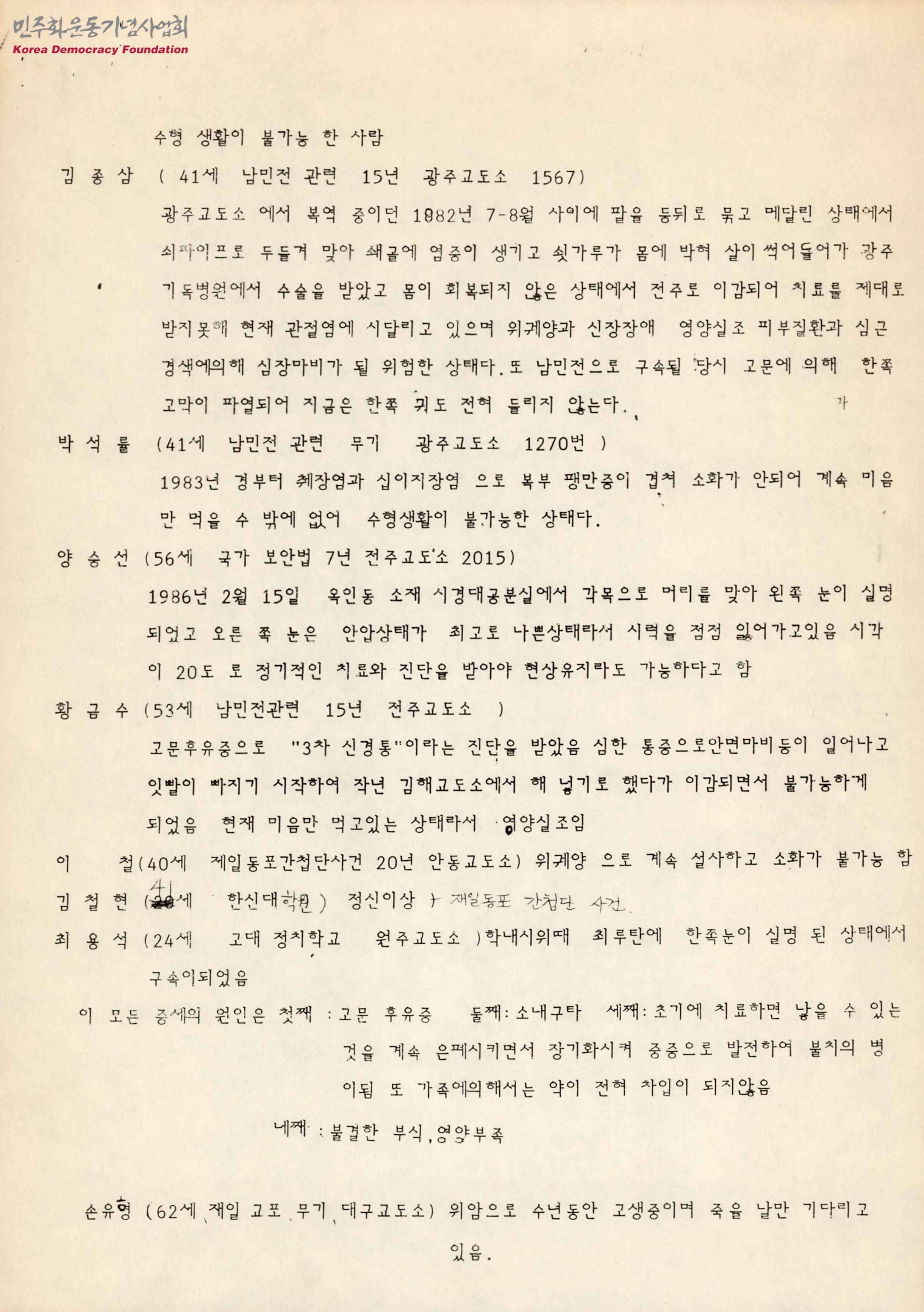 - 국가보안법 위반 혐의로 구속된 양심수 김종삼 등 8명이 건강의 이유로 수형생활이 불가능 하다고 적힌 문서로 증세의 원인은 고문후유증, 소내 구타, 영양부족, 진료 거부라고 적혀있음