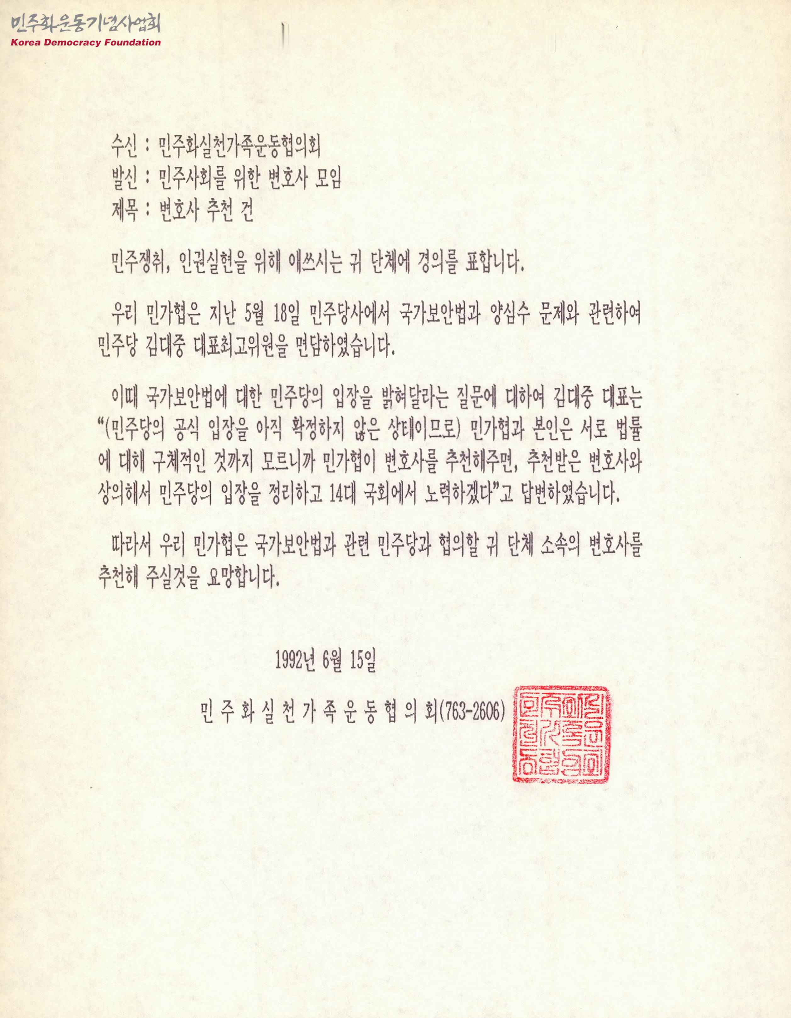 - 민주화실천가족운동협의회에서 각 언론사에게 보낸 문서로 유럽의회 청문회 가족 참가건에 대하여 언론에 반영 될 수 있도록 노력해 줄 것을 부탁하는 내용 등이 수록되어 있음