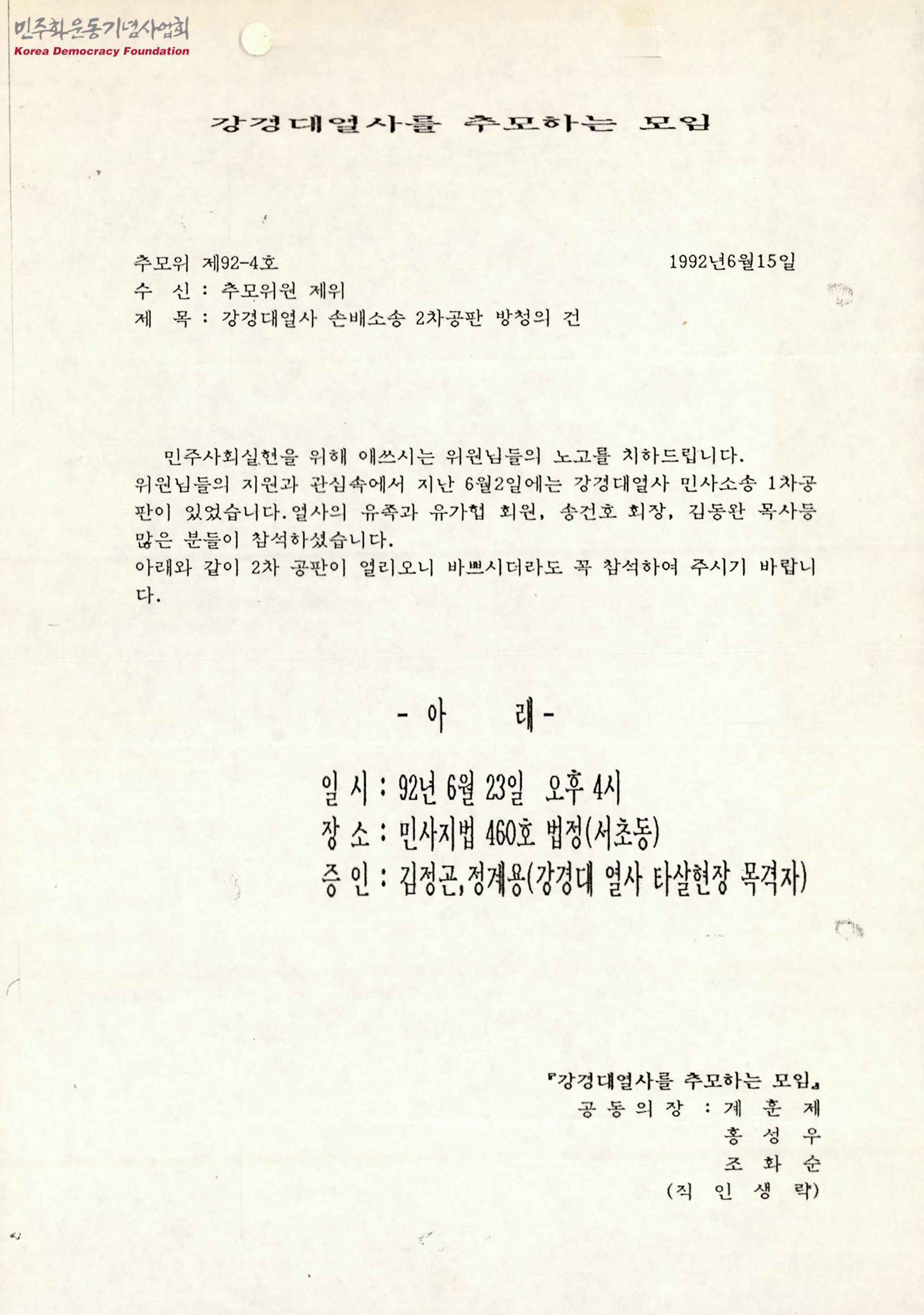 - 강경대 열사를 추모하는 모임에서 추모위원 제위에게 보낸 문서로 강경대 열사 손배소송 2차공판 참석을 요청하는 내용과 공판의 일시 및 장소, 증인 등이 수록되어 있음