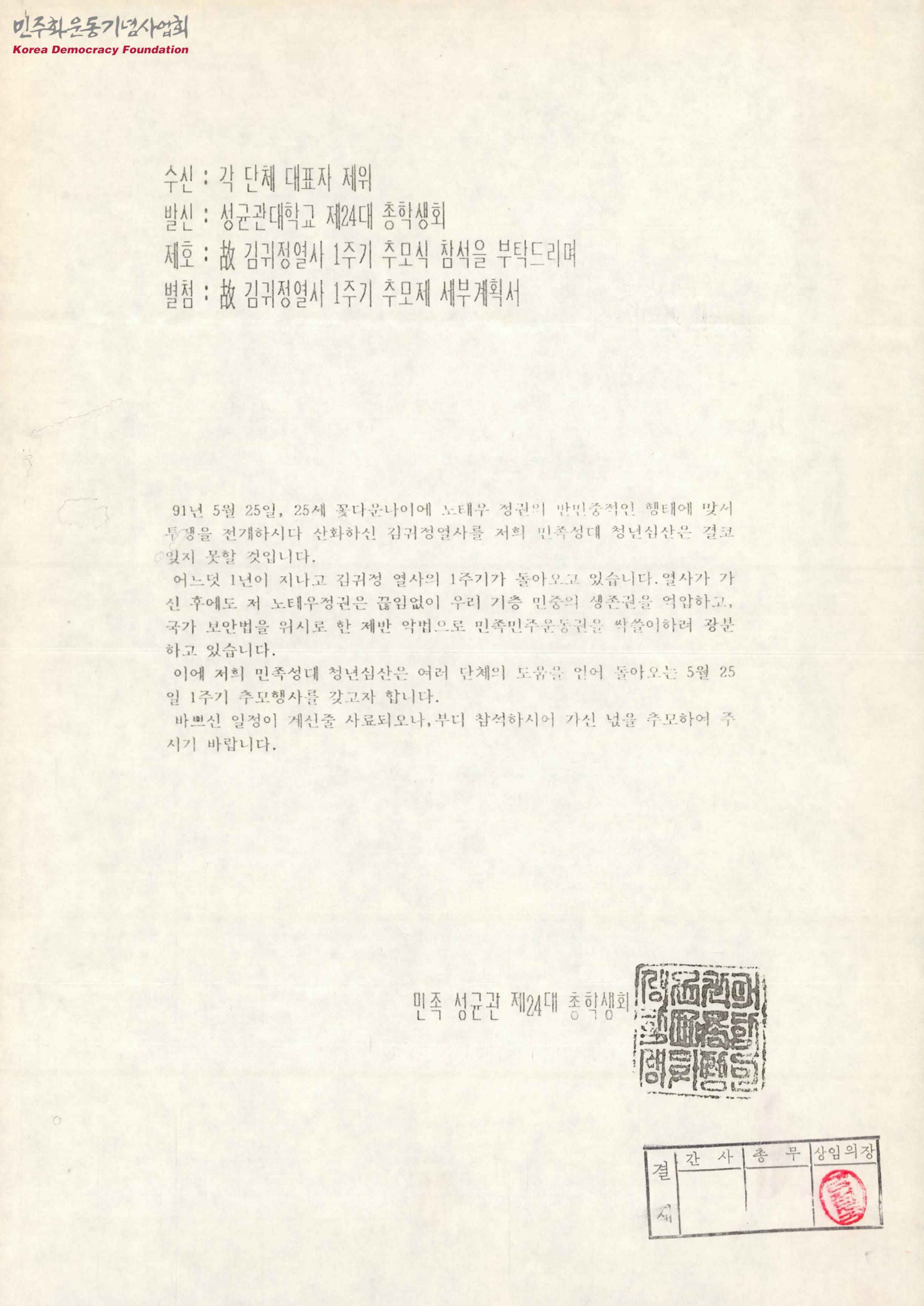 - 성균관대학교 제24대 총학생회에서 각 단체 대표자 제위에게 보낸 김귀정 열사 1주기 추모식 참석을 부탁하는 문서로 추모제 세부계획서가 별첨되어 있으며 '참가단체', '장소 및 시간', '추모식순' 등의 내용이 수록되어 있음