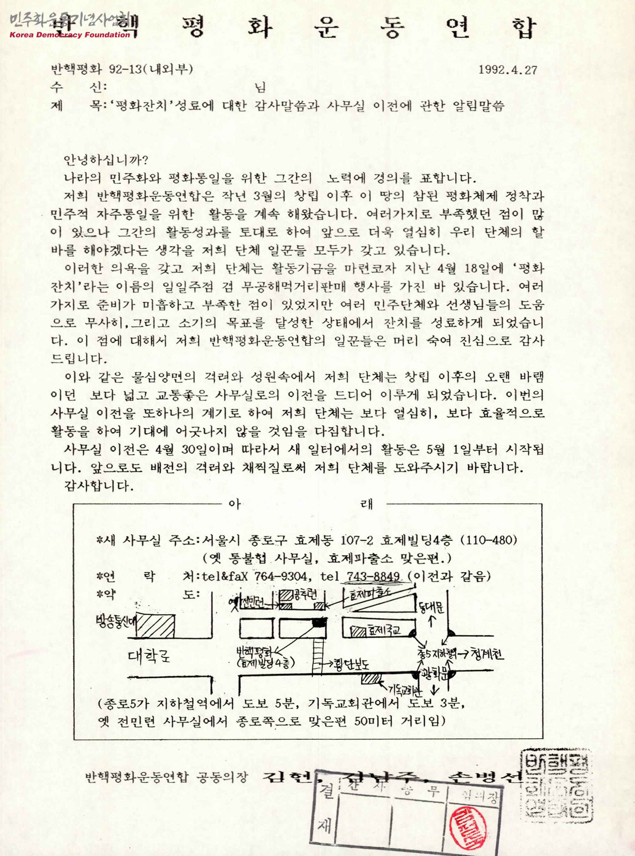[반핵평화운동연합에서 보내는 '평화잔치' 성료에 대한 감사말씀과 사무실 이전에 관한 문서]