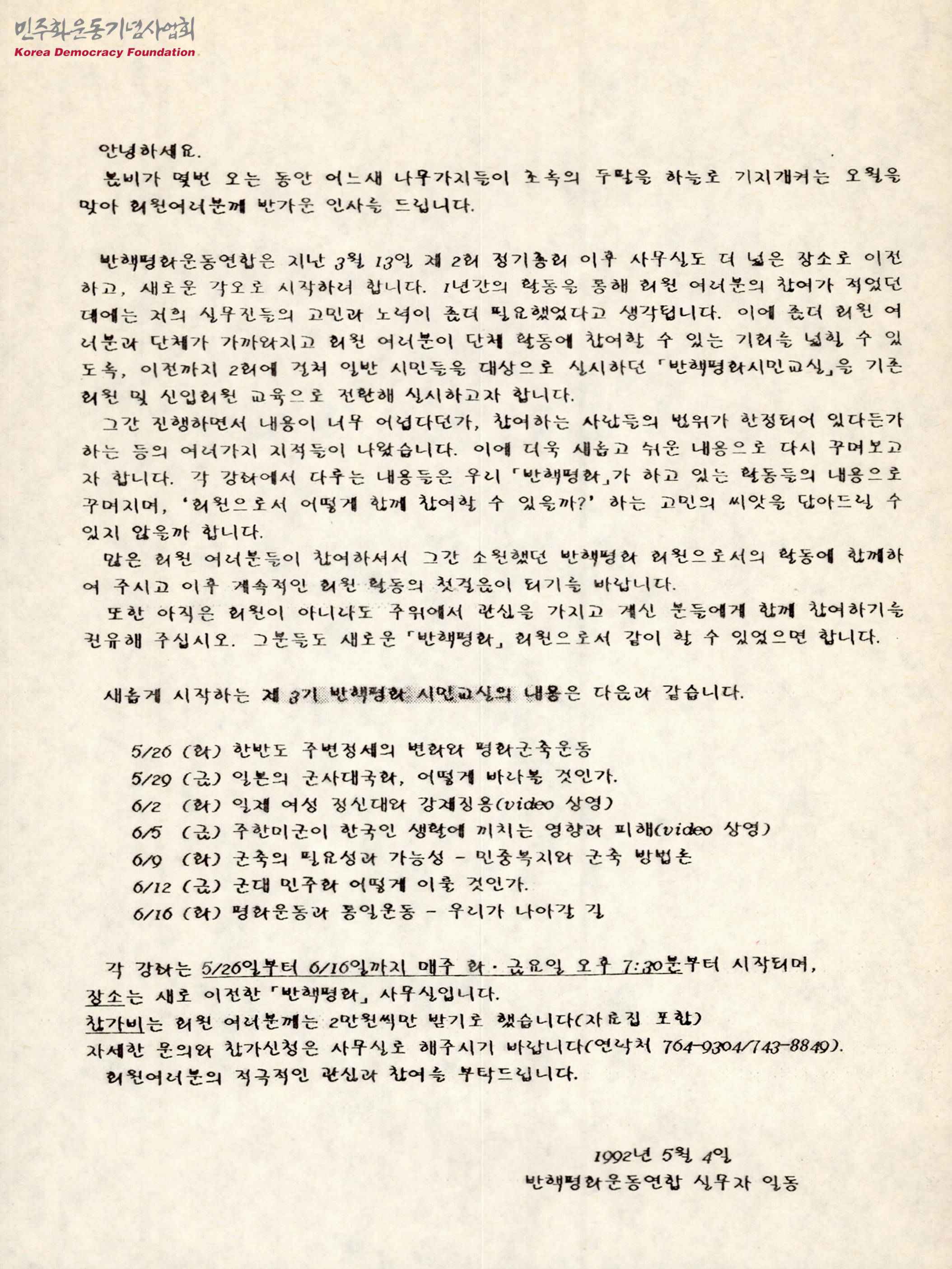 - 반핵평화운동연합에서 이전까지 2회에 걸쳐 일반 시민들을 대상으로 실시하던 「반핵평화시민교실」을 기존 회원 및 신입회원 교육으로 전환해 실시한다는 내용의 문서로 각 각좌의 일시 및 주제, 참가비 등의 내용이 수록되어 있음