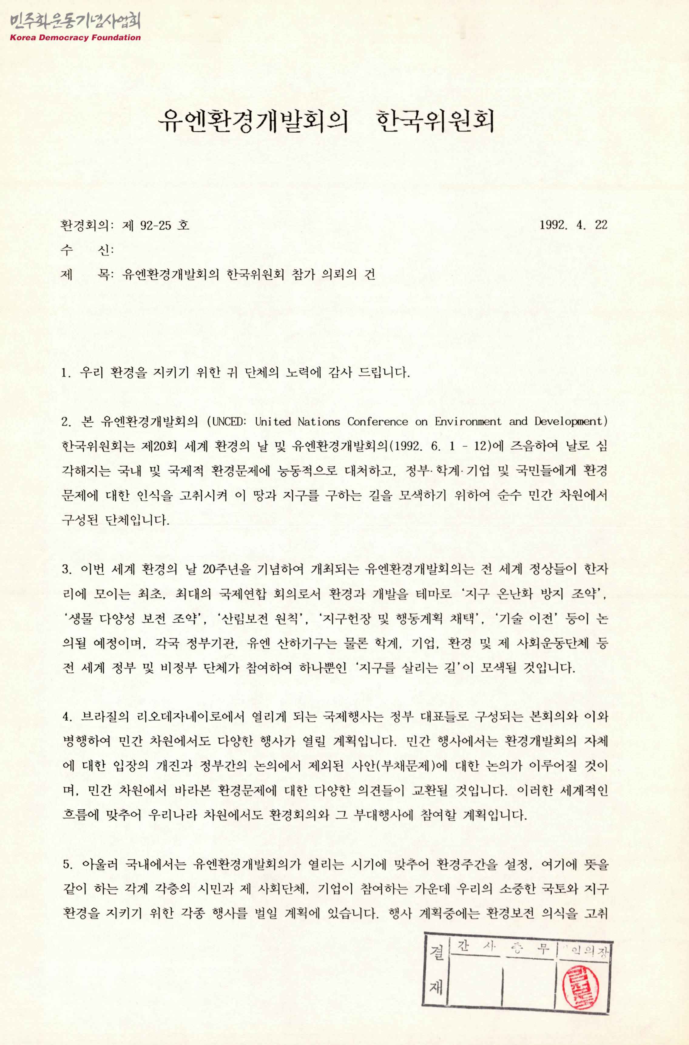 [유엔환경개발회의 한국위원회 행사 참가 의뢰 제92-25호 문서]
