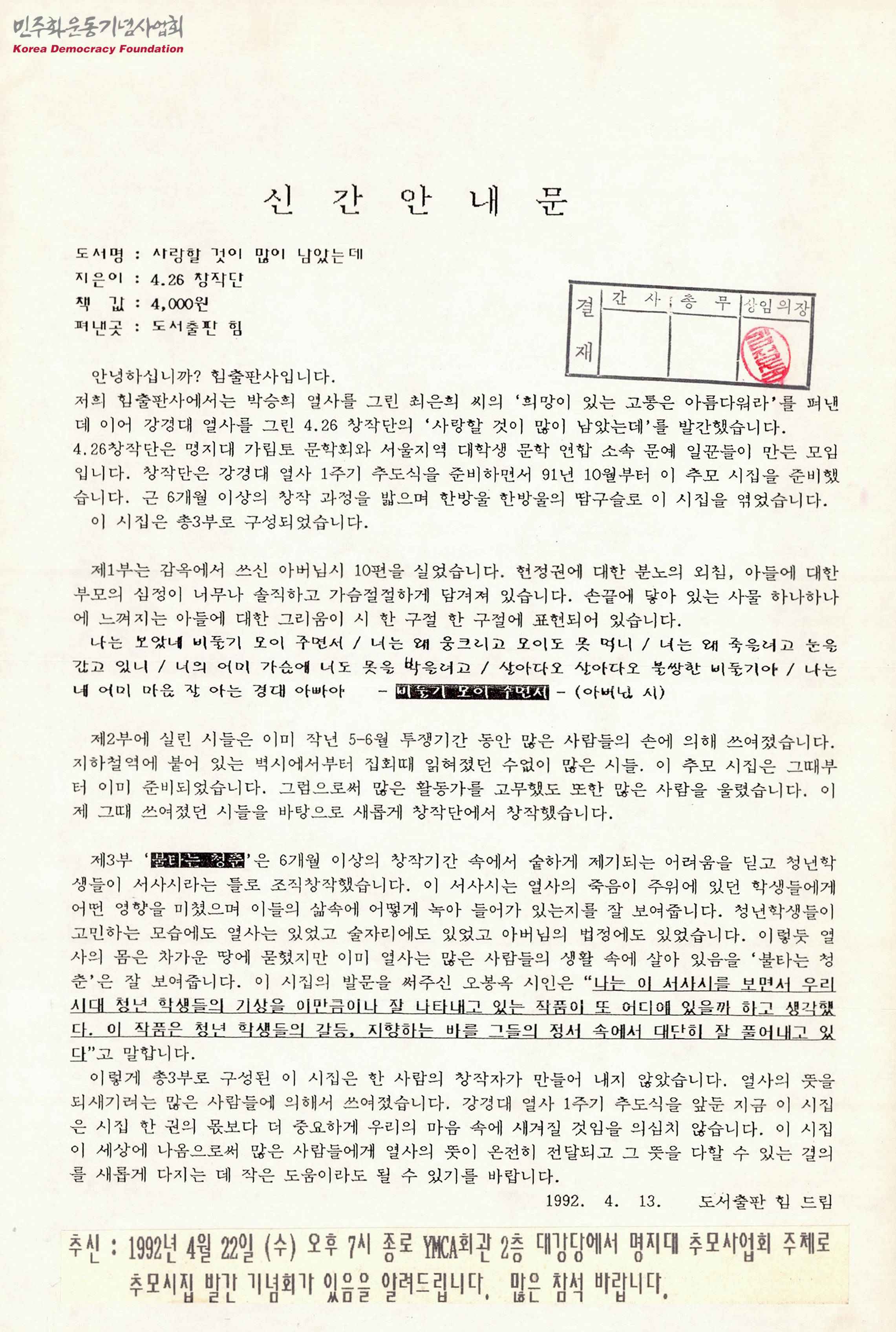 - 도서출판 힘에서 펴낸 신간 도서 '사랑할 것이 많이 남았는데'의 안내문으로 강경대 열사를 그린 '사랑할 것이 많이 남았는데'는 강경대 열사 1주기 추도식을 준비하며 4.26 창작단이 만든 추모 시집으로 총 3부로 구성되어 있으며, 강경대 열사의 뜻이 온전히 전달 되고 결의를 새롭게 다지는데 작은 도움이 되기를 바라는 내용 등이 수록되어 있음