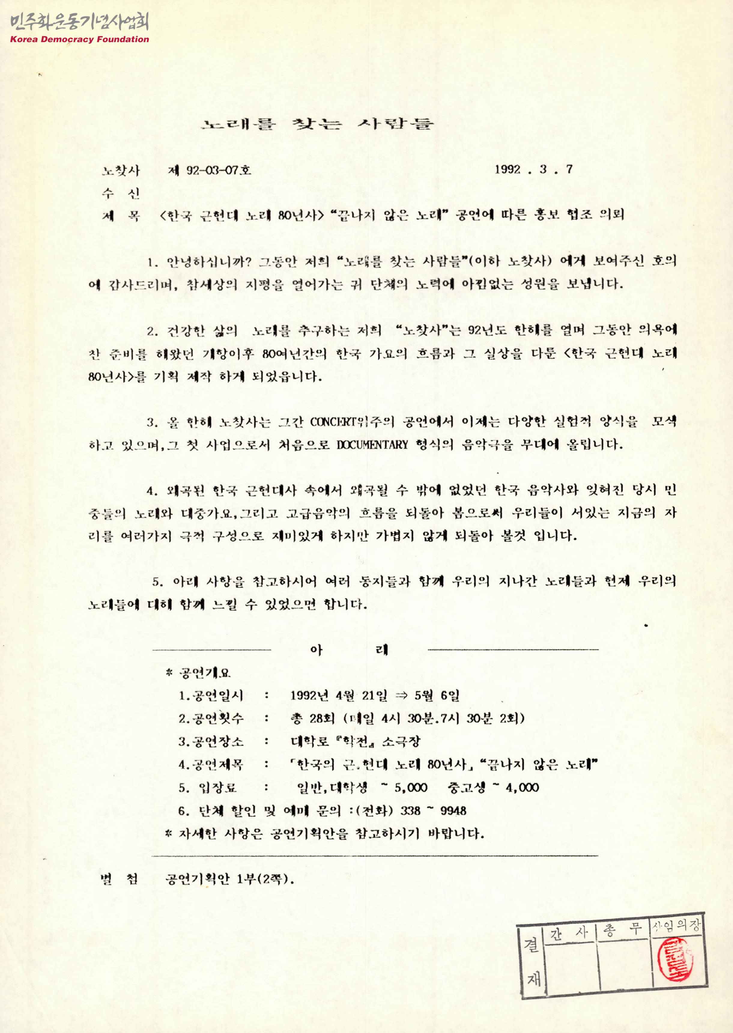- 노래를 찾는 사람들이 개항 이후 80여년 간의 한국 가요의 흐름과 실상을 다룬 <한국 근현대 노래 80년사>를 기획·제작하였다는 내용을 다룬 문서로 '공연 일시 및 장소', '공연 횟수', '공연 제목', '입장료' 등의 내용과 '공연기획안 1부'가 함께 첨부되어 있음