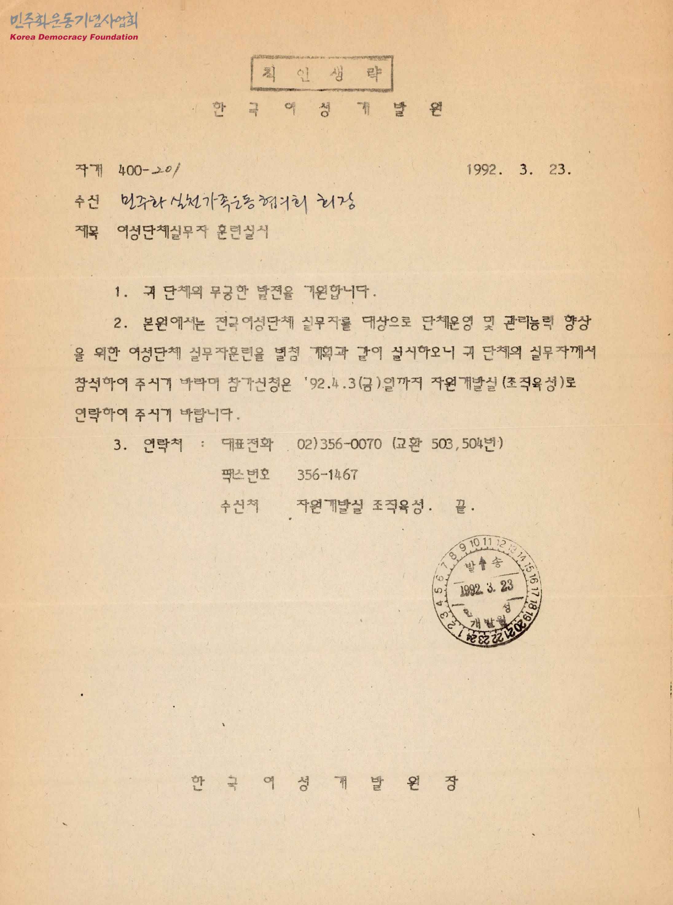 [한국여성개발원이 민주화실천가족운동협의회에게 보낸 여성단체실무자 훈련실시 문서]