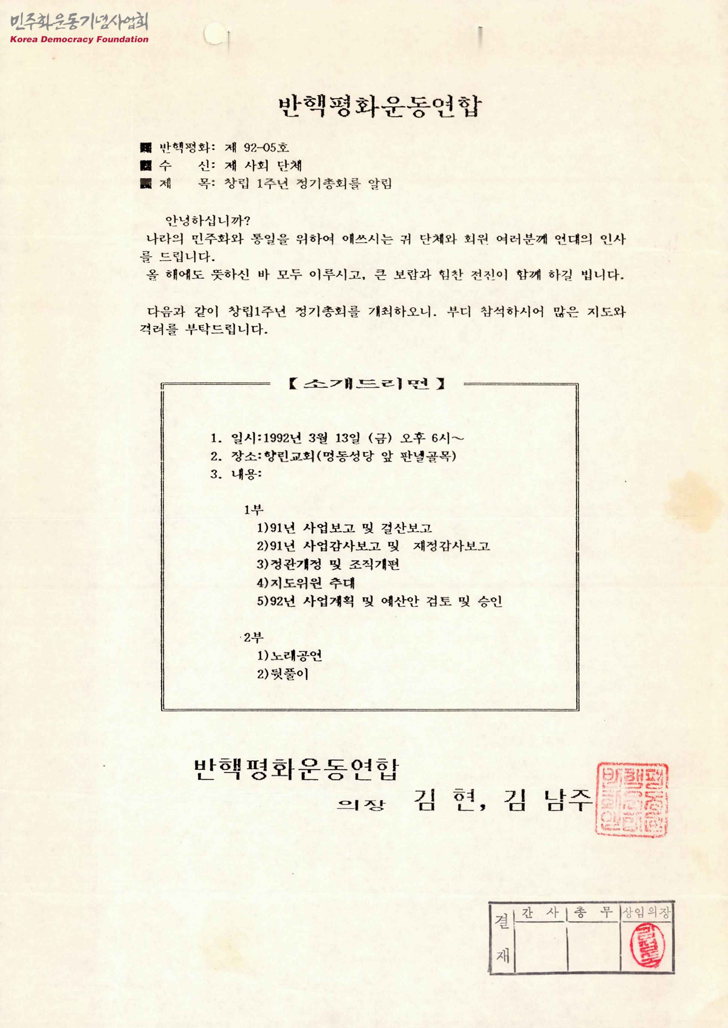 [반핵평화운동연합에서 제 사회 단체로 보내는 창립 1주년 정기총회 안내문]