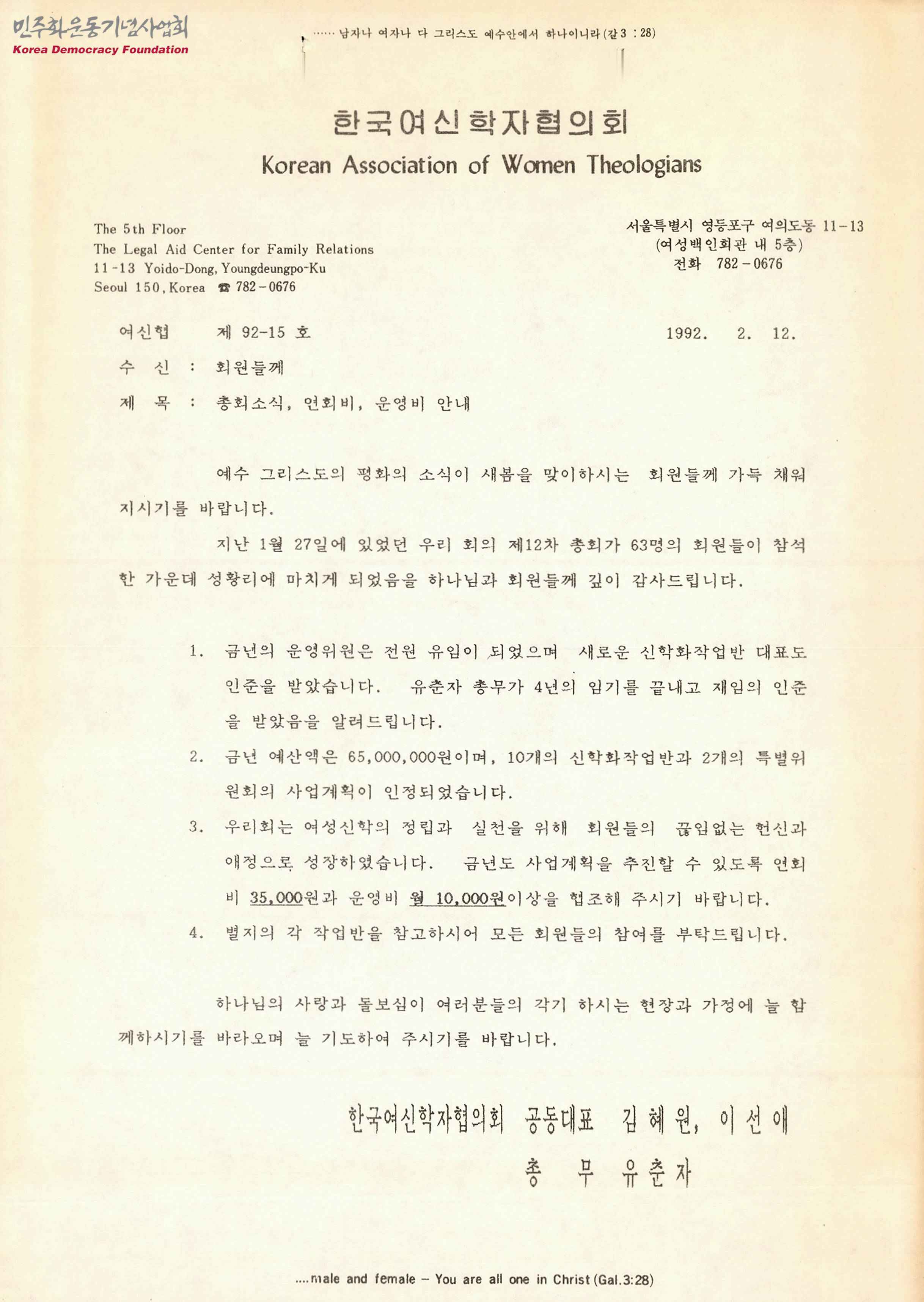 [한국여신학자협의회에서 회원에게 보내는 총회소식, 연회비, 운영비 안내문]