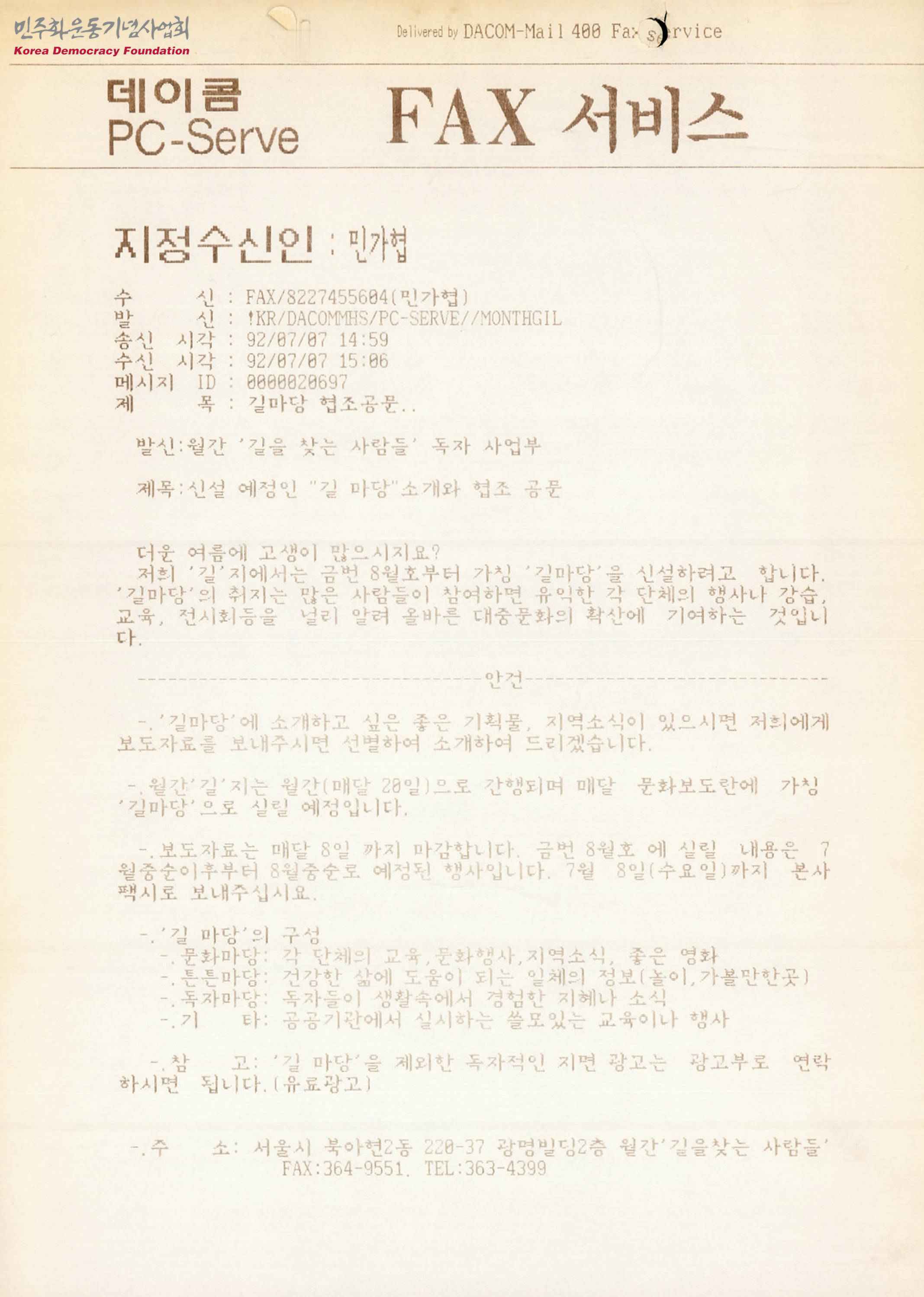 [월간 '길을 찾는 사람들' 독자 사업부에서 민주화실천가족운동협의회로 보내는 길마당 협조 공문]