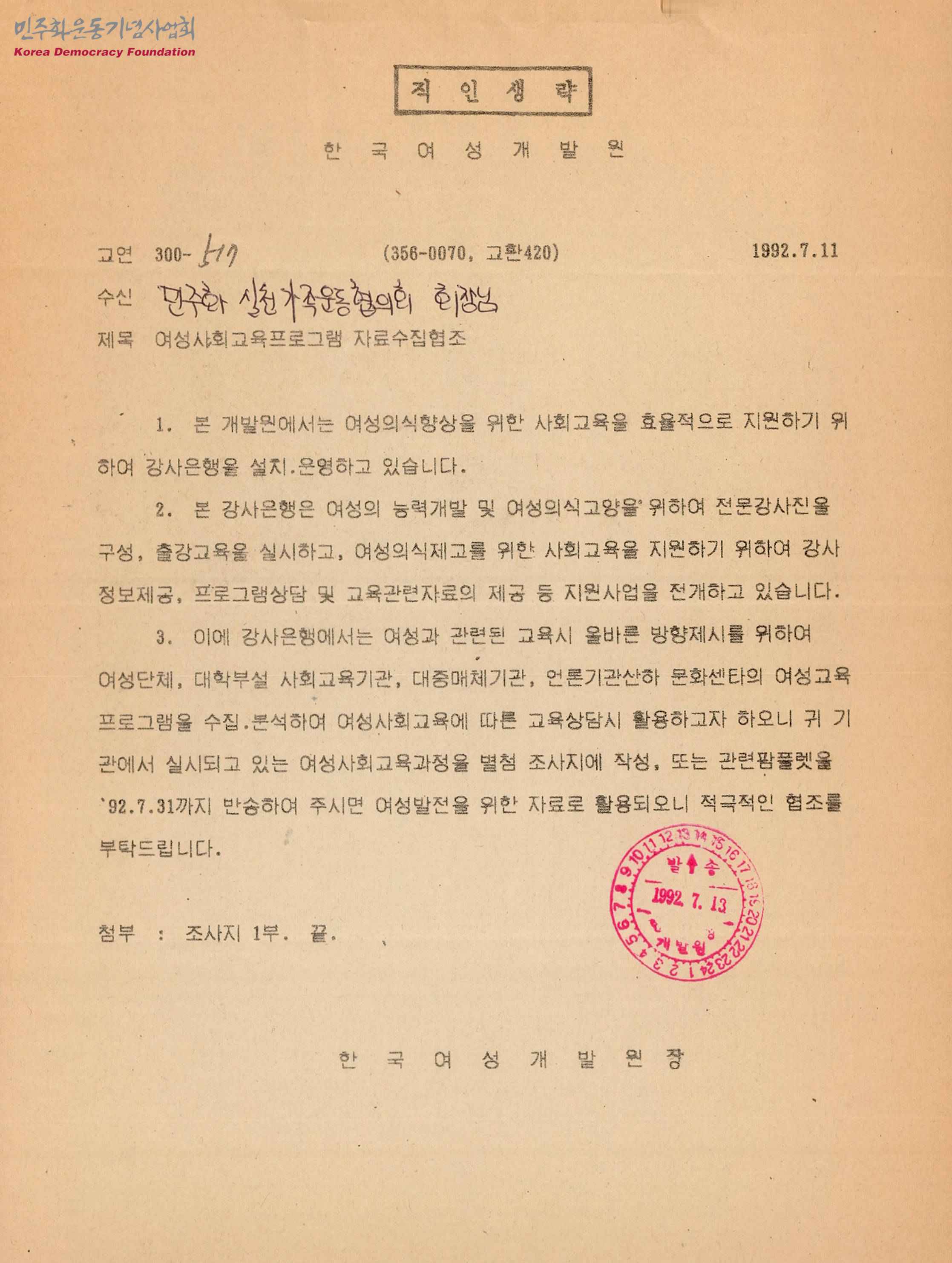 - 한국여성개개발원에서 민주화실천가족운동협의회로 보낸 여성사회교육프로그램 자료수집 협조문으로 여성의 능력개발 및 여성의식 고양을 위한 자료로 활용되니 적극적인 협조를 부탁하는 내용과 설문조사지 1부 등이 수록되어 있음