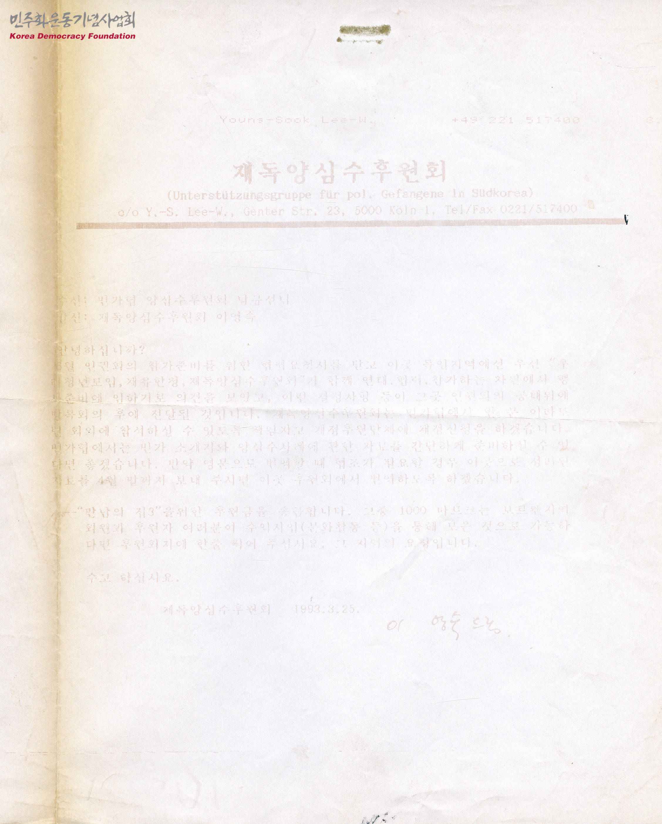- 6월 인권회의 참가준비를 위한 협력요청서에 독일지역의 단체 3곳에서 연대·협력·참가하는 차원에서 행사준비에 임하기로 했다는 내용, "만남의 집3"을 위한 후원금을 송금한다는 내용 등이 수록된 팩스