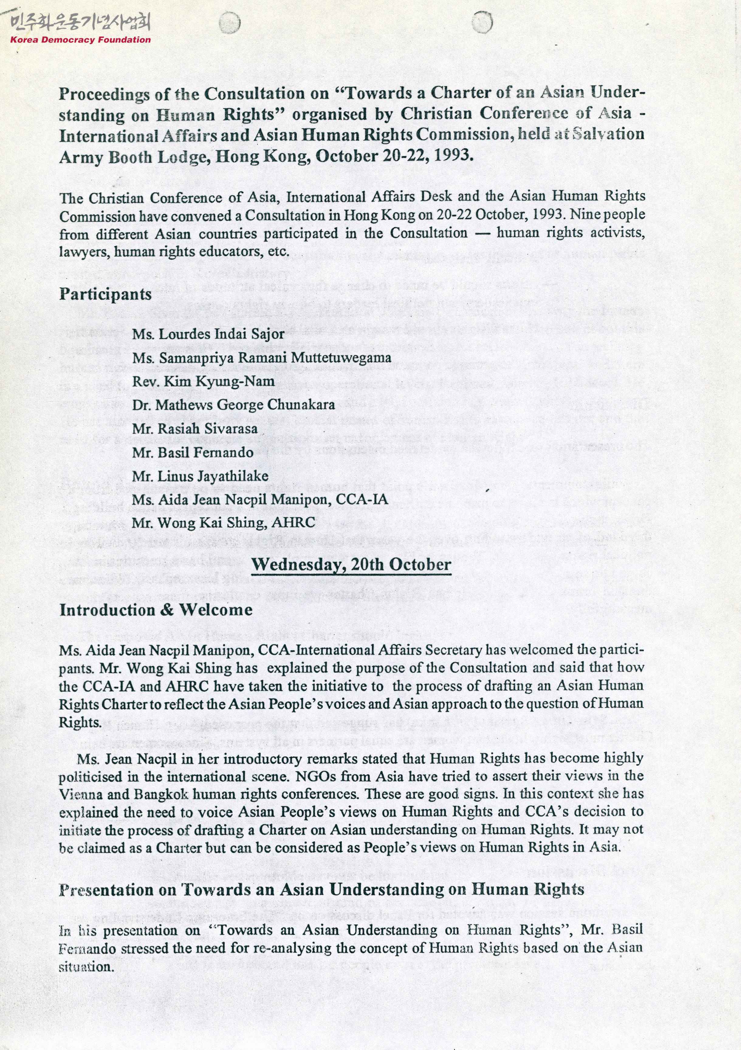 - 1993년 10월 20일부터 22일까지 홍콩 구세군에서 열린 인권에 대한 "아시아 이해 헌장을 향하여" 협의의 진행을 다룬 문서로, 다음과 같은 내용이 수록됨 참가자 소개 & 환영, 인권에 대한 아시아인의 이해를 위한 발표, 토론, 라운드 테이블 공유 등의 10월 20일 일정 지역에 대한 과제와 의제, 전략을 파악하기 위한 기획 세션이 진행된 10월 21일 일정 제안된 인권 헌장에서 다룰 이슈와 주제 선정, 결정과 제안을 이행하는 그룹의 구성 결정이 진행된 10월 22일 일정