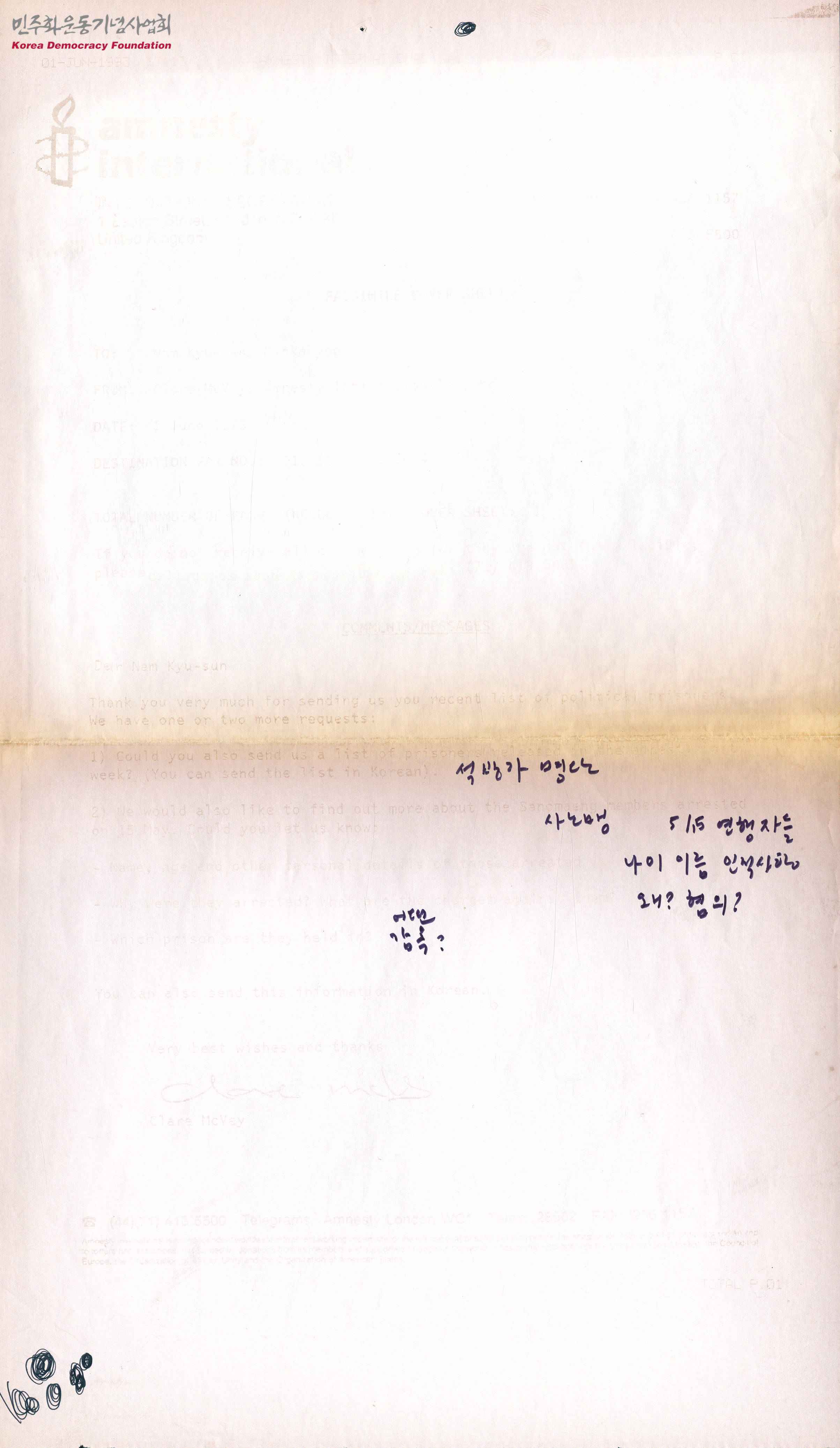 - 석방자 명단 요청, 5월 15일자 사노맹의 연행자들 명단 요청 등의 내용이 수록된 것으로 추정되는 편지