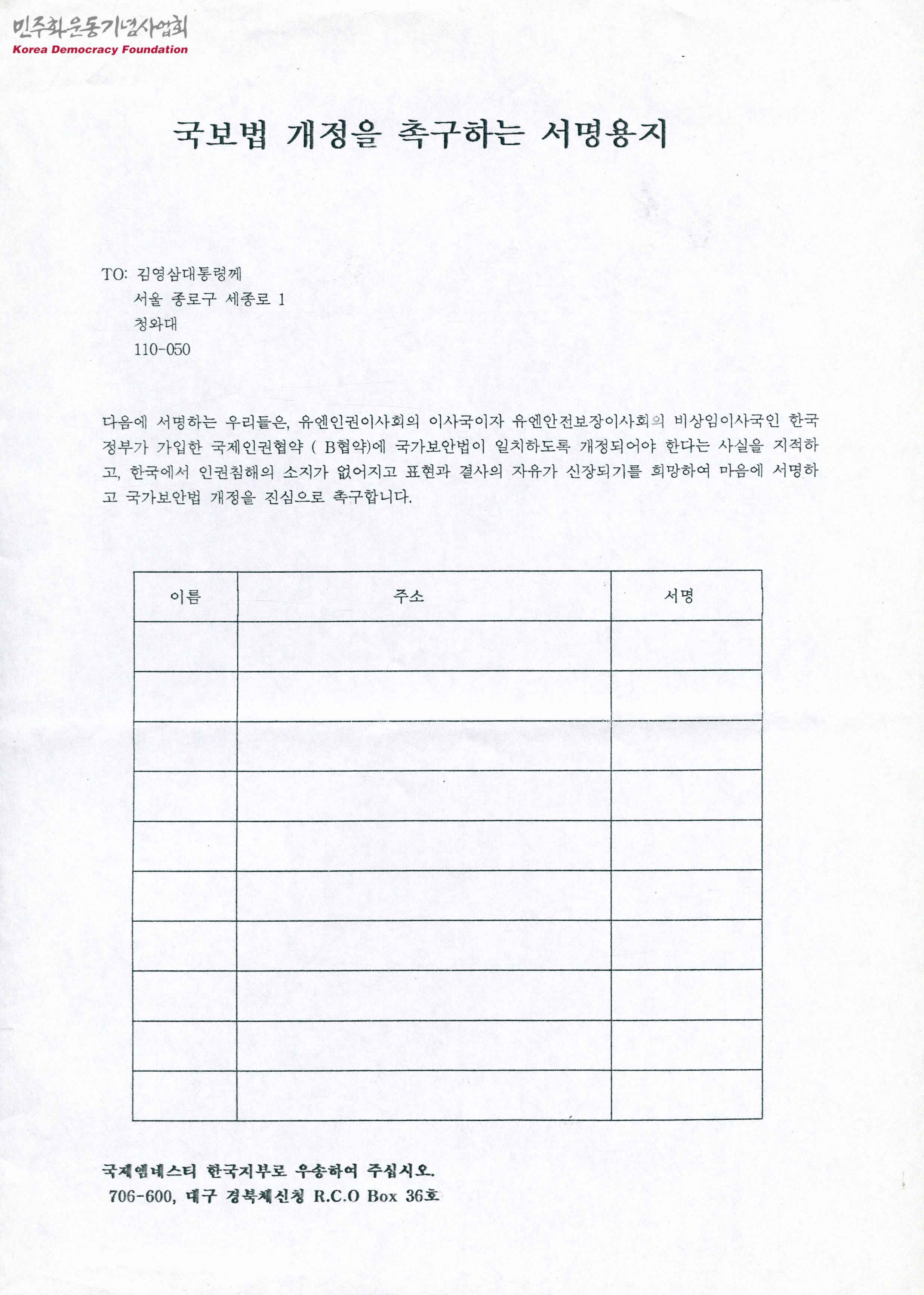 - 한국정부가 가입한 국제인권협약에 국가보안법이 일치하도록 개정해야 한다는 사실의 지적과 인권침해의 소지가 없어지고 표현과 결사의 자유가 신장되기를 희망한다는 내용의 국가보안법 개정 촉구 서명용지 양식