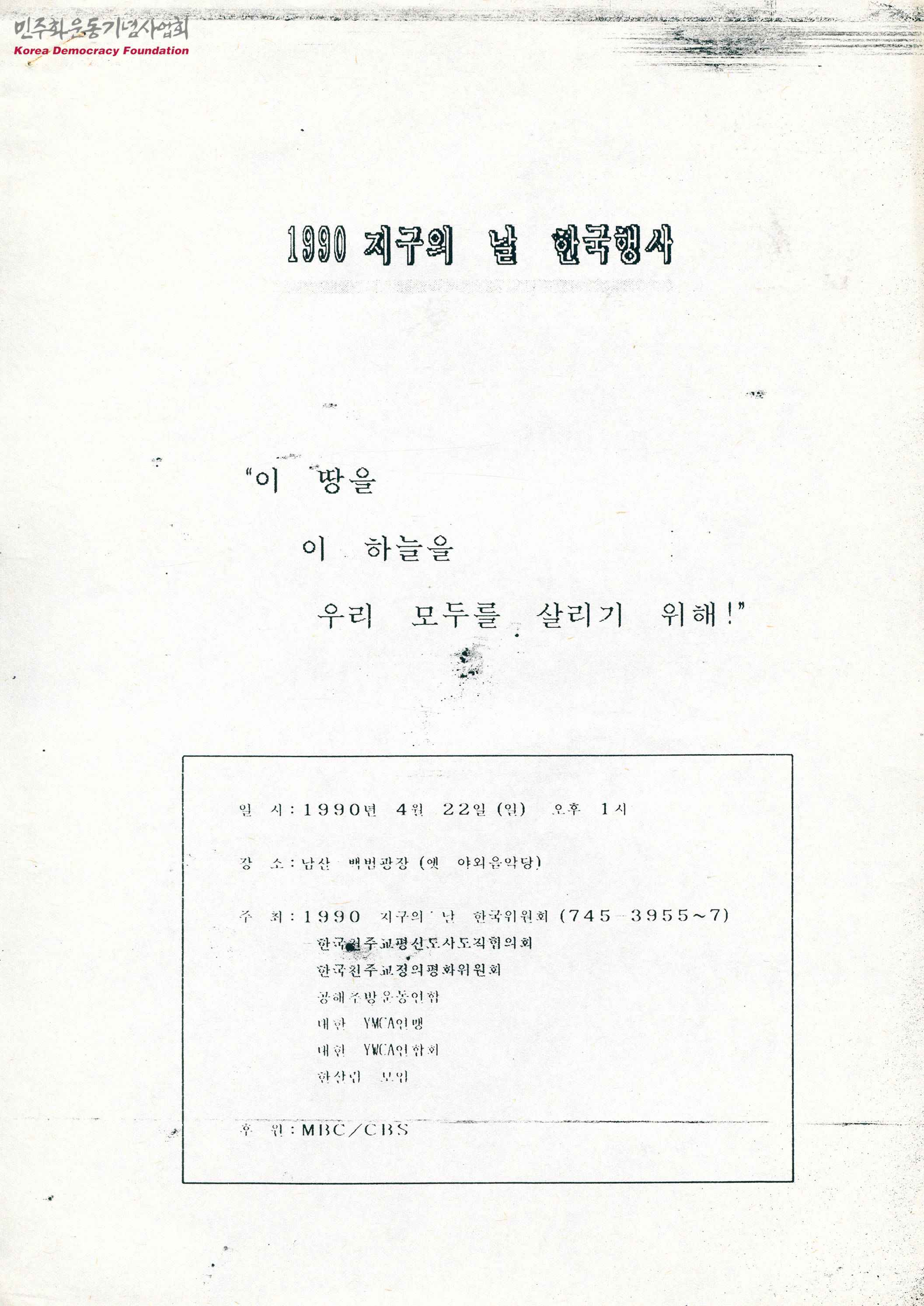 - 지구환경개선을 위한 국제 연대운동인 지구의 날의 일시, 장소, 주최, 후원 등이 수록된 문서로, 다음과 같은 내용이 수록됨 지구의 날 한국행사 개요 1990년 4월 지구의 날 한국행사 참가단체 의뢰의 것