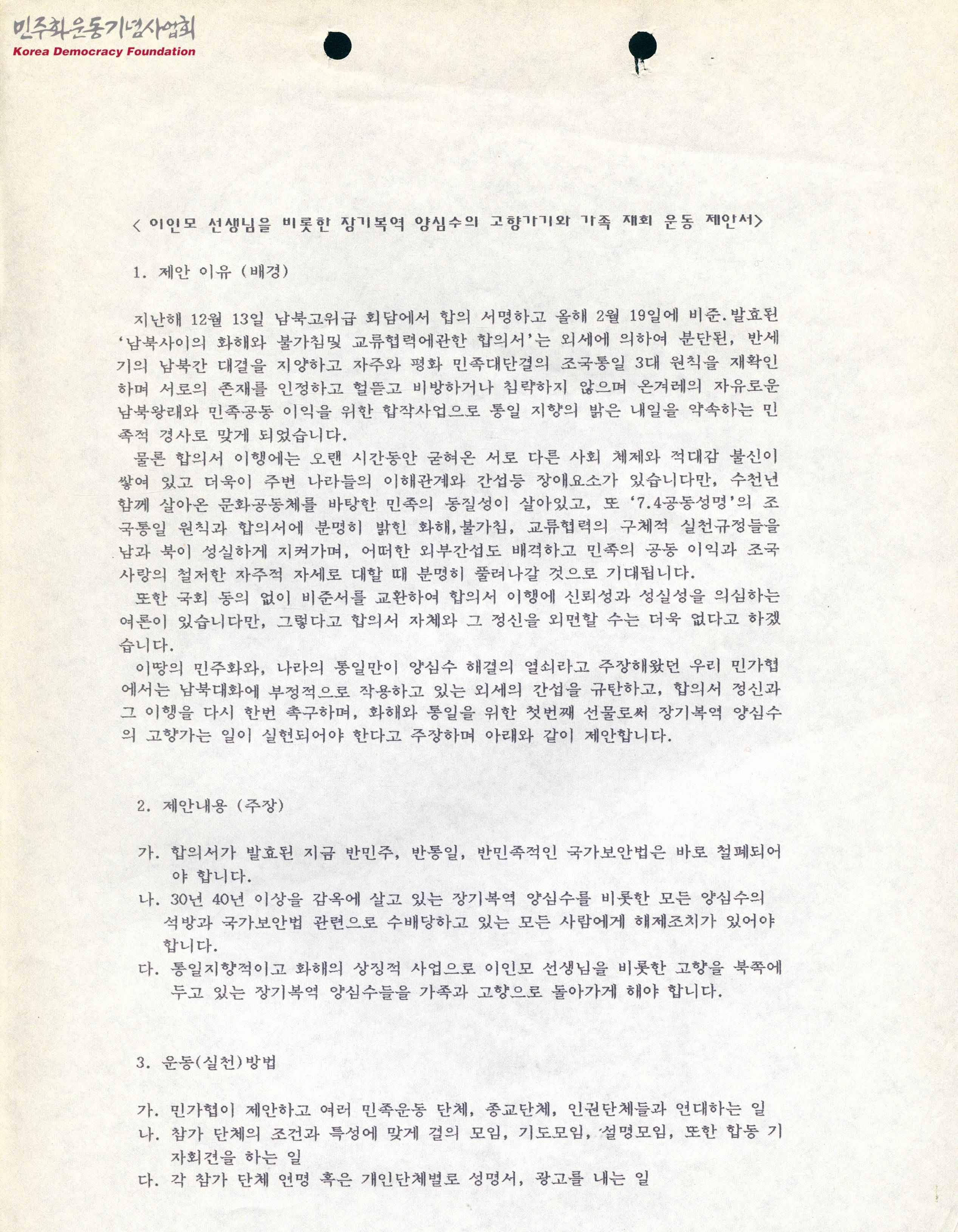 - 남북의 화해와 통일을 위한 첫번째 선물로 장기복역 양심수의 고향가는 일을 실현하자고 주장하는 제안서로, 제안 이유, 내용, 실천 방법, 실천 기조 등의 내용이 수록됨