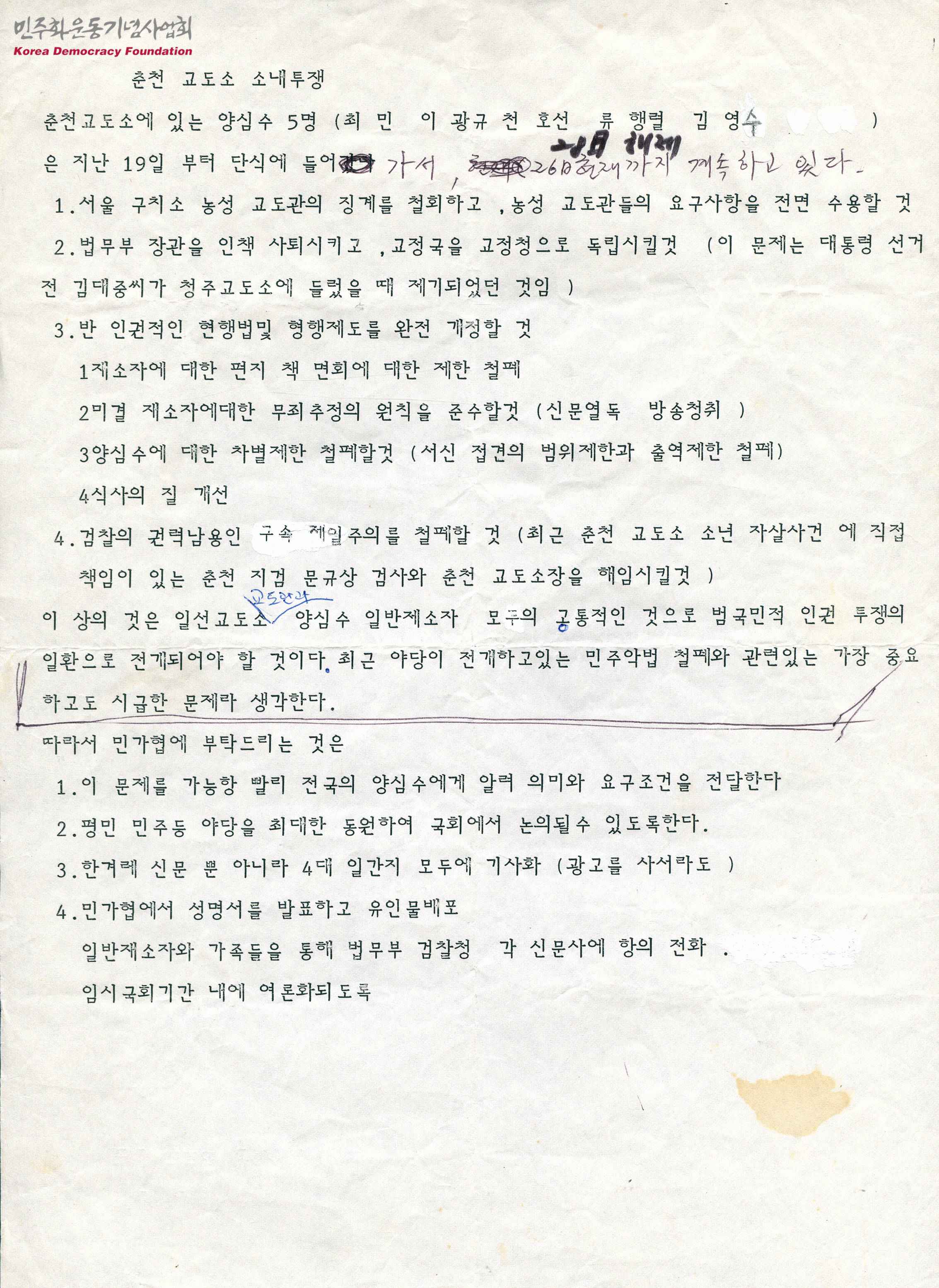 - 춘천교도소의 양심수 5명이 서울구치소 농성 교도관의 징계철회, 법무부 장관의 사퇴, 반인권적인 현행법 및 형행제도의 개정 등을 외치며 단식에 들어갔으니 민주화실천가족운동협의회에 이 문제를 전국의 양심수에게 알려 의미와 요구조건을 전달할 것, 평민 민주등 양당을 최대한 동원해 국회에서 논의될 수 있도록 할 것, 한겨레 신문 뿐 아니라 4대 일간지 모두에 기사화 해줄 것 등을 부탁하는 내용의 문서