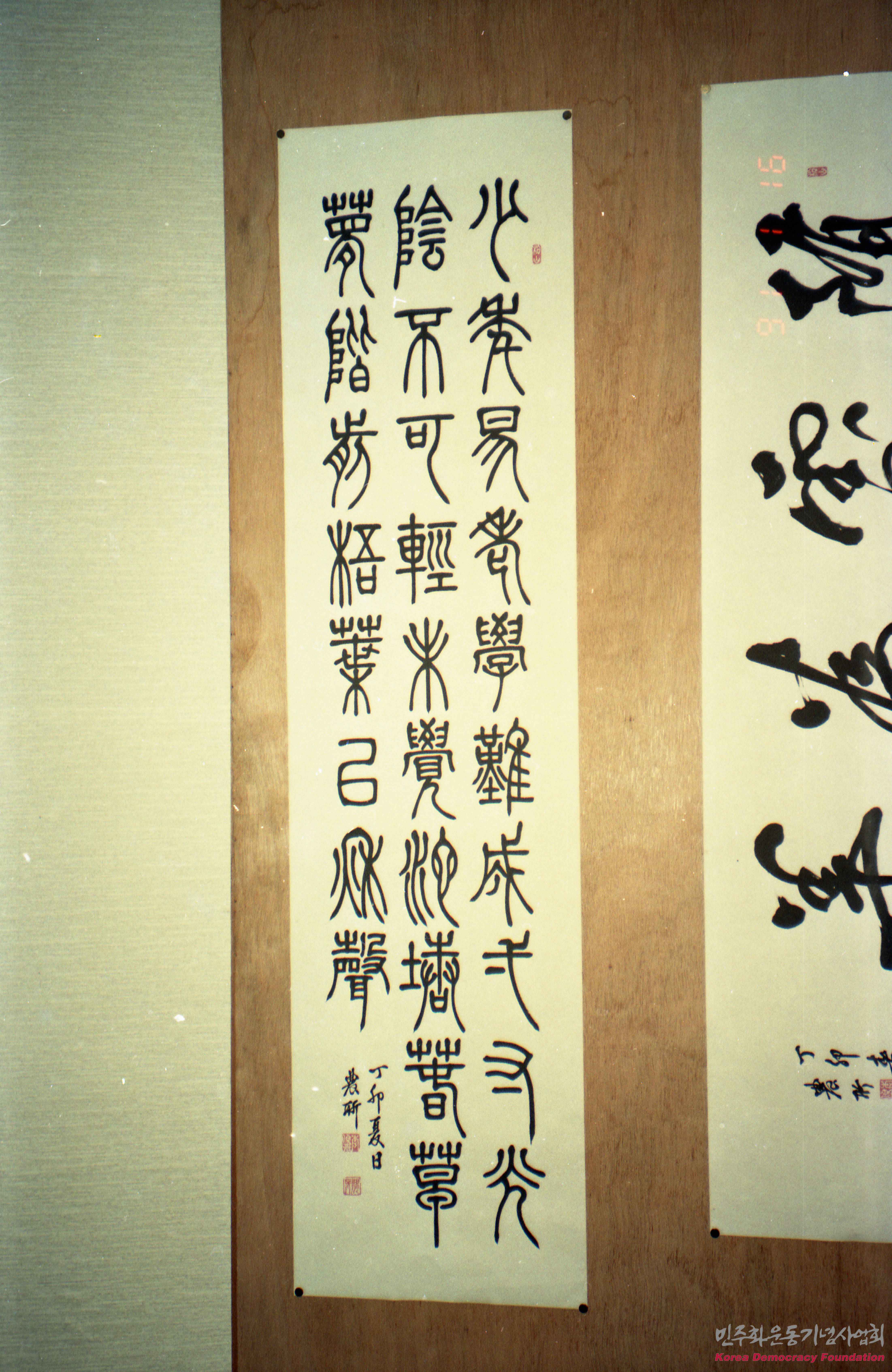 - "丁印專日 農於"라고 끝나는 것으로 추정되는 서예 두 개를 찍은 사진