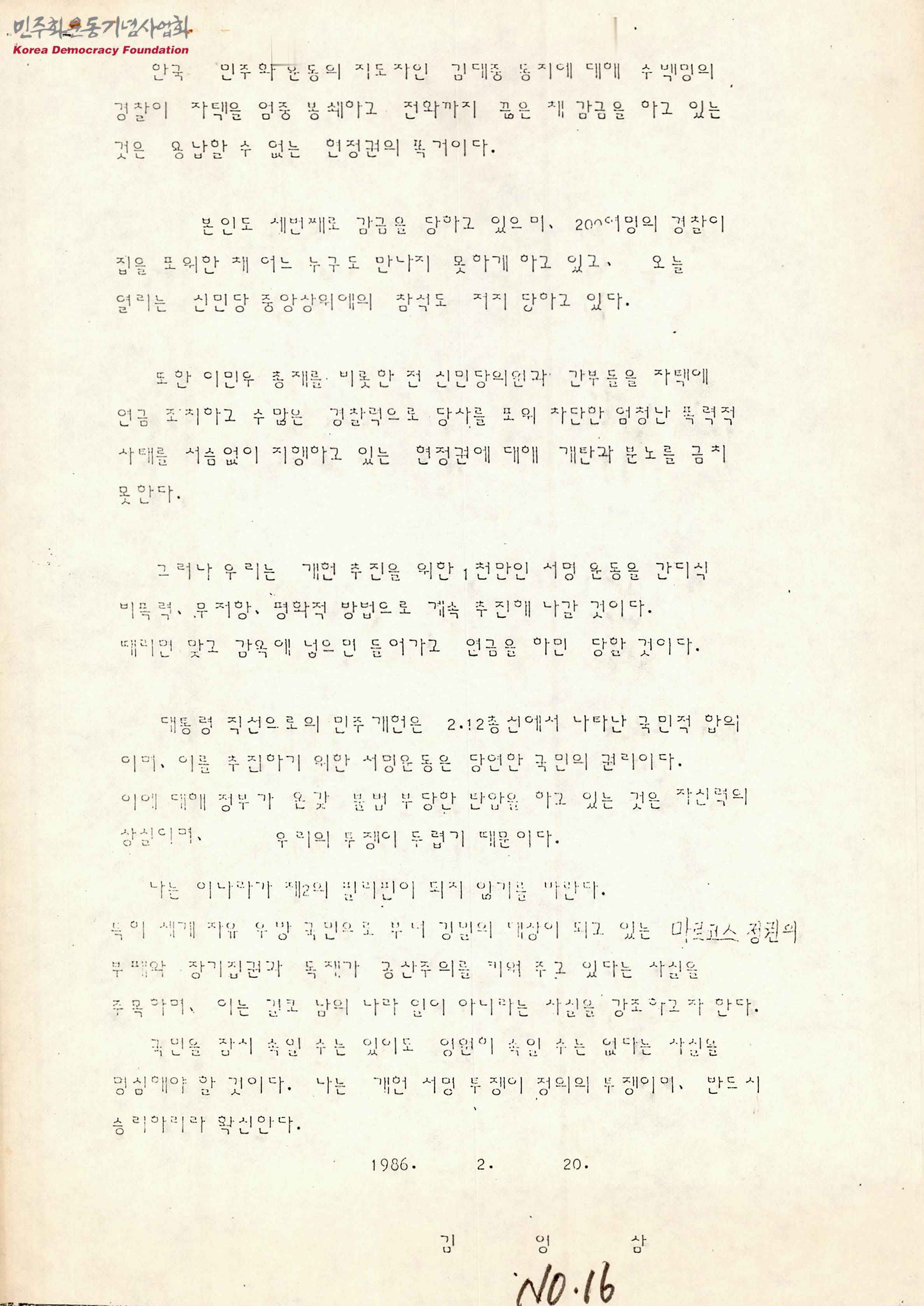 [민주인사 감금에 대한 김영삼의 입장문]