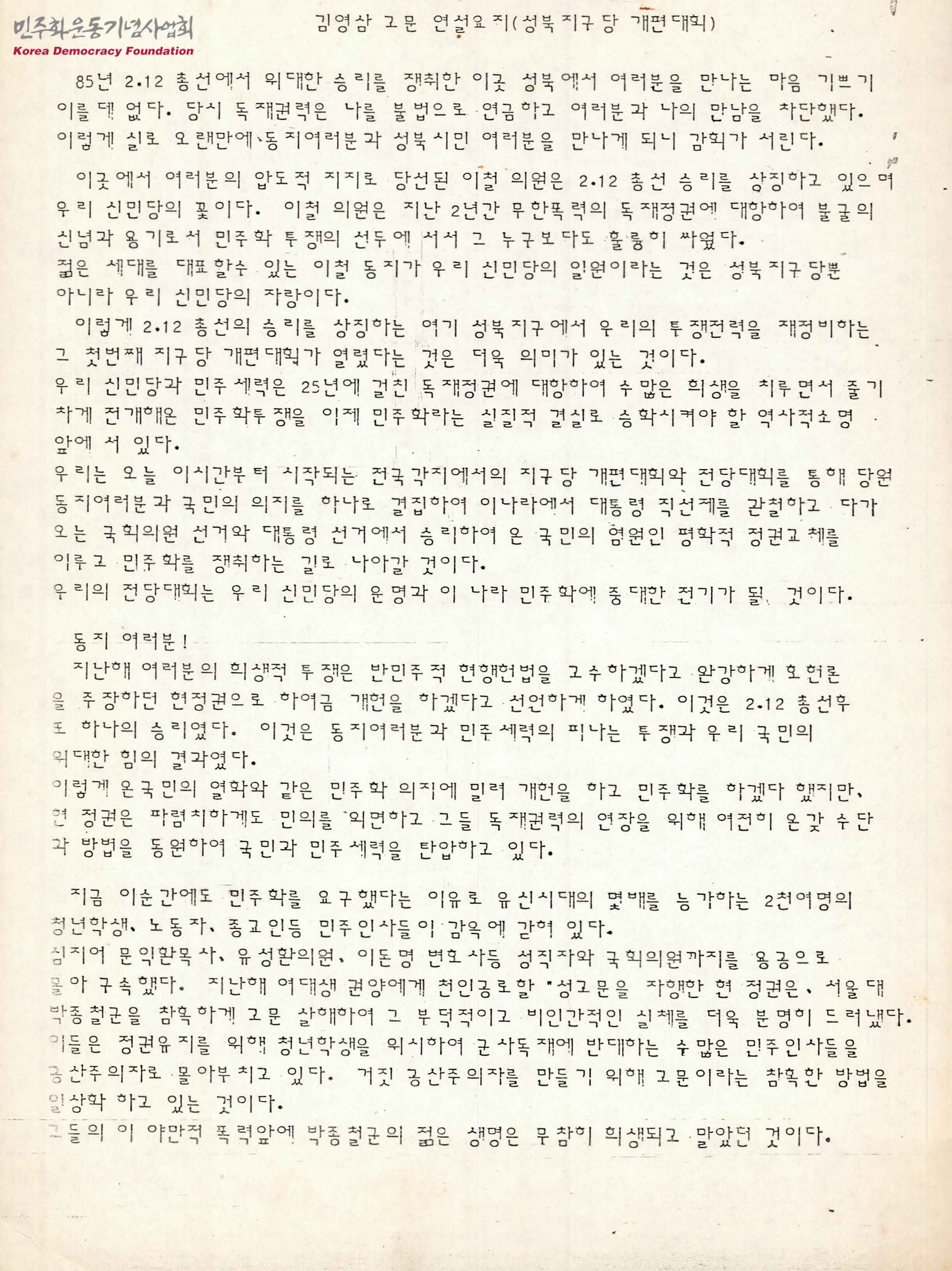 성북지구당 개편대회 김영삼 고문 연설요지