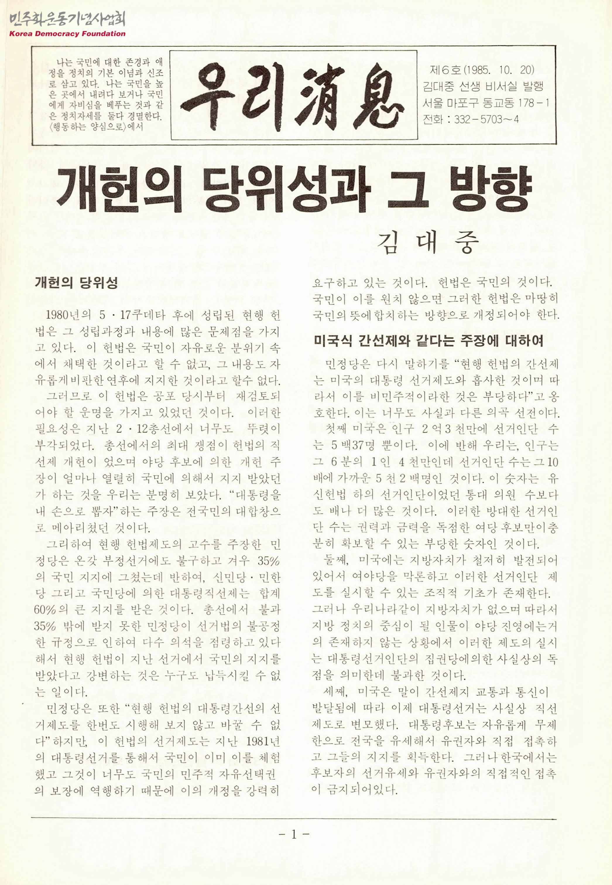 - 우리소식 제6호 간행물로 수록된 글은 다음과 같음 - 개헌의 당위성과 그 방향 - 김대중 선생의 사면·복권 촉구 - 88년 대통령선거 공정하고 자유로워야 김대중씨의 완전한 권리회복 거듭 희망 - 김대중 씨에게 보이지 않는 쇠고랑 - 한국의 정치인 김대중씨