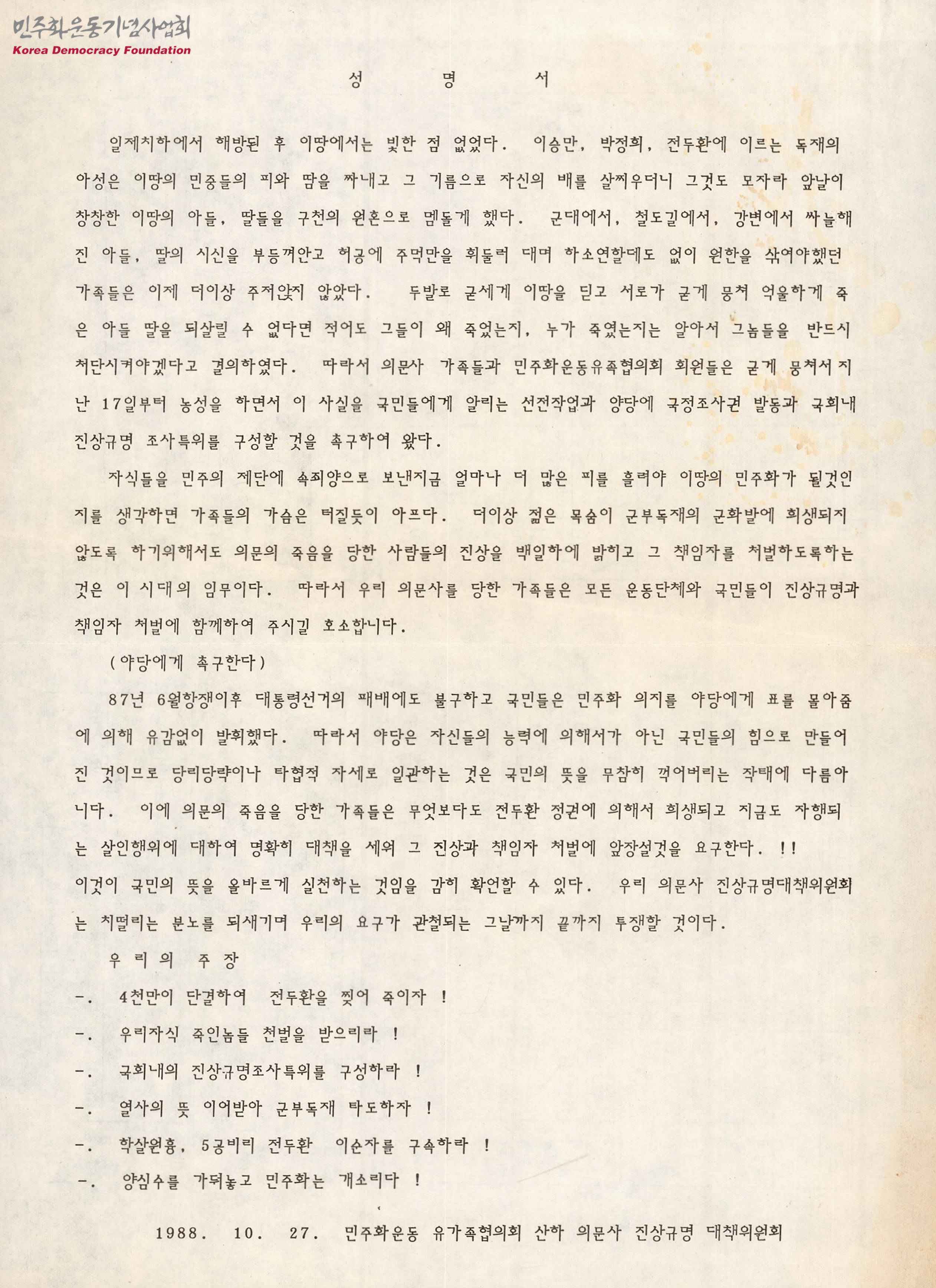 - 독재정권이 아들, 딸들을 구천을 맴돌게 했고 이에 적어도 그들이 왜 죽었는지, 누가 죽였는지 알아내 그들을 처단하기로 결의하였고, 국민과 야당에게 진상규명과 책임자 처벌에 함께 해 줄것을 촉구하는 내용의 성명서로 진상규명을 요청한 의문사 피해자의 명단이 첨부됨