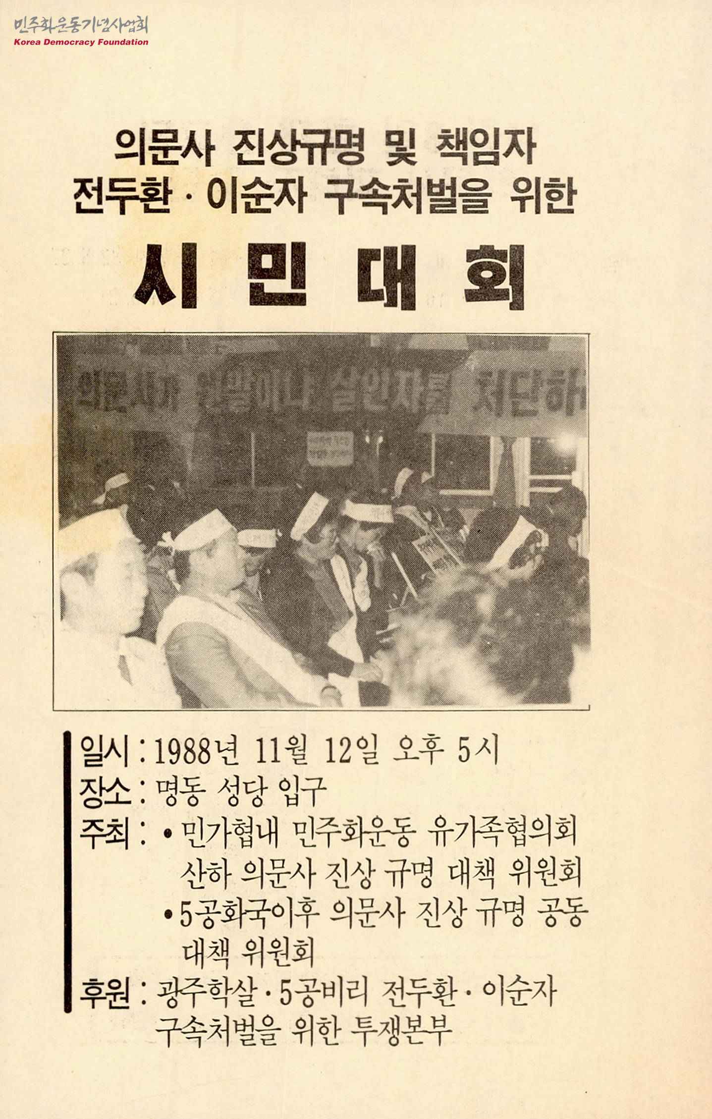 - 의문사 진상규명 및 책임자 전두환·이순자 구속처벌을 위한 시민대회 유인물로 행사의 일시와 장소, 주최, 후원, 현재 신고된 의문사 피해자 명단이 수록됨