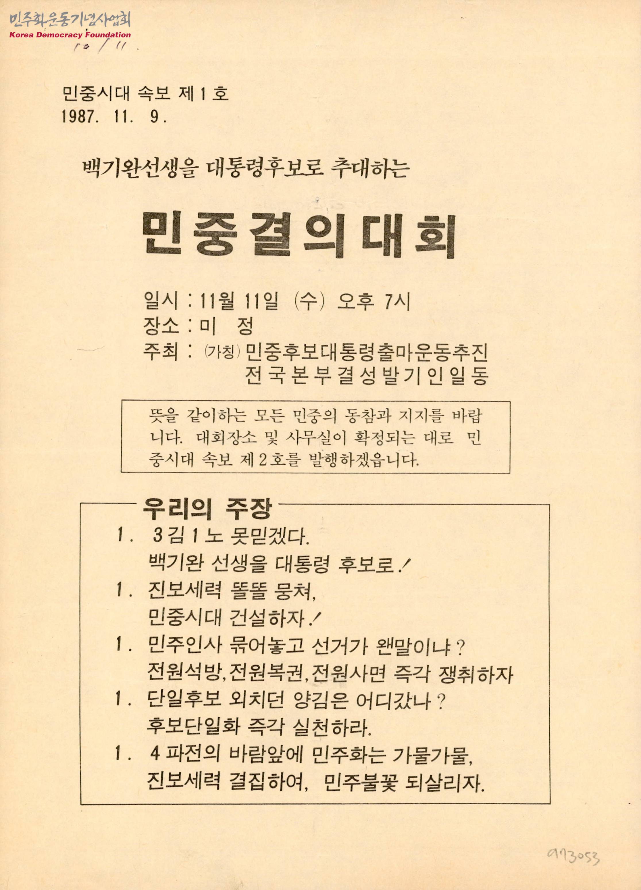 백기완선생을 대통령후보로 추대하는 민중결의대회