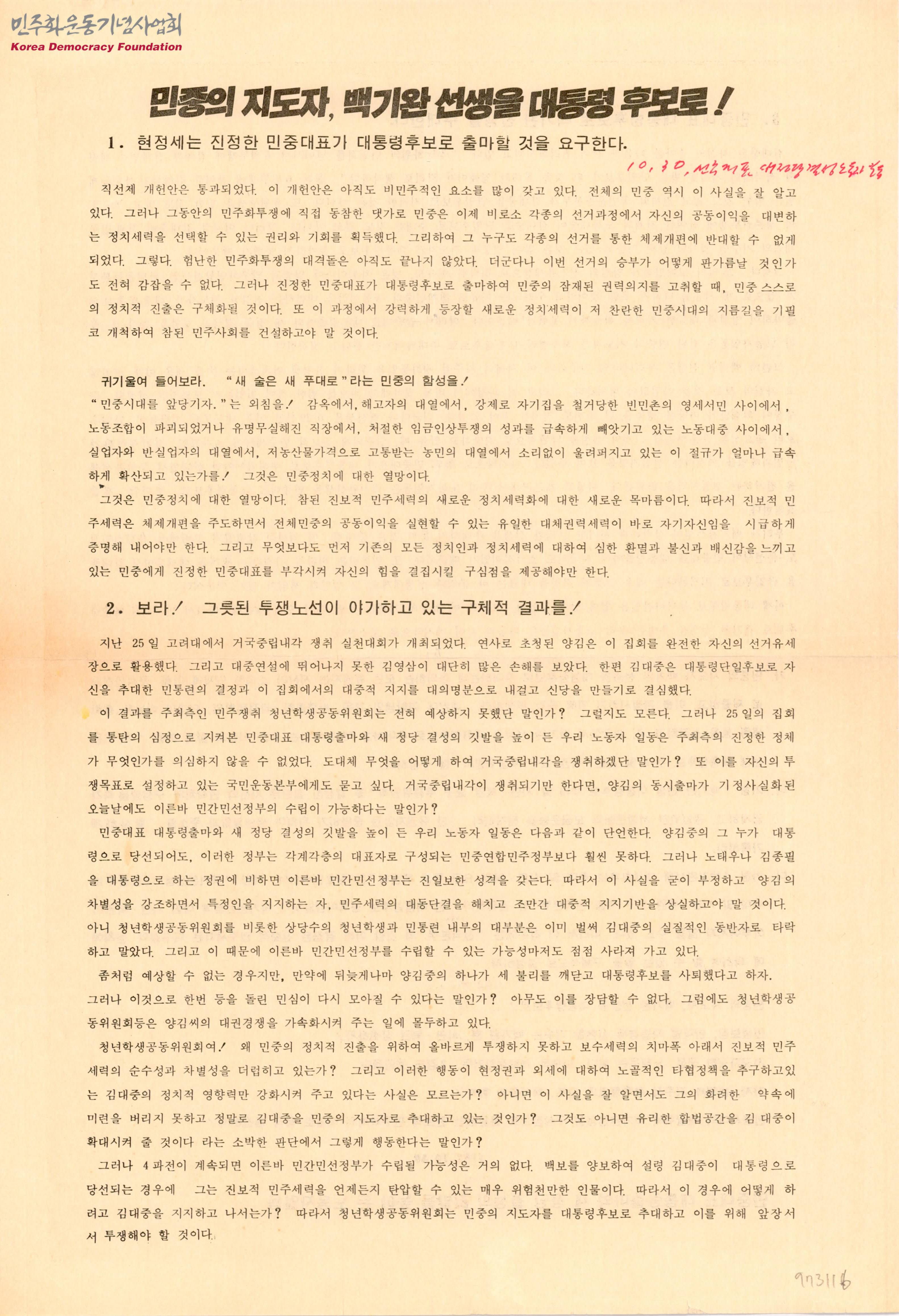 - 민중대표대통령출마와새정당결성의깃발을높이든노동자일동