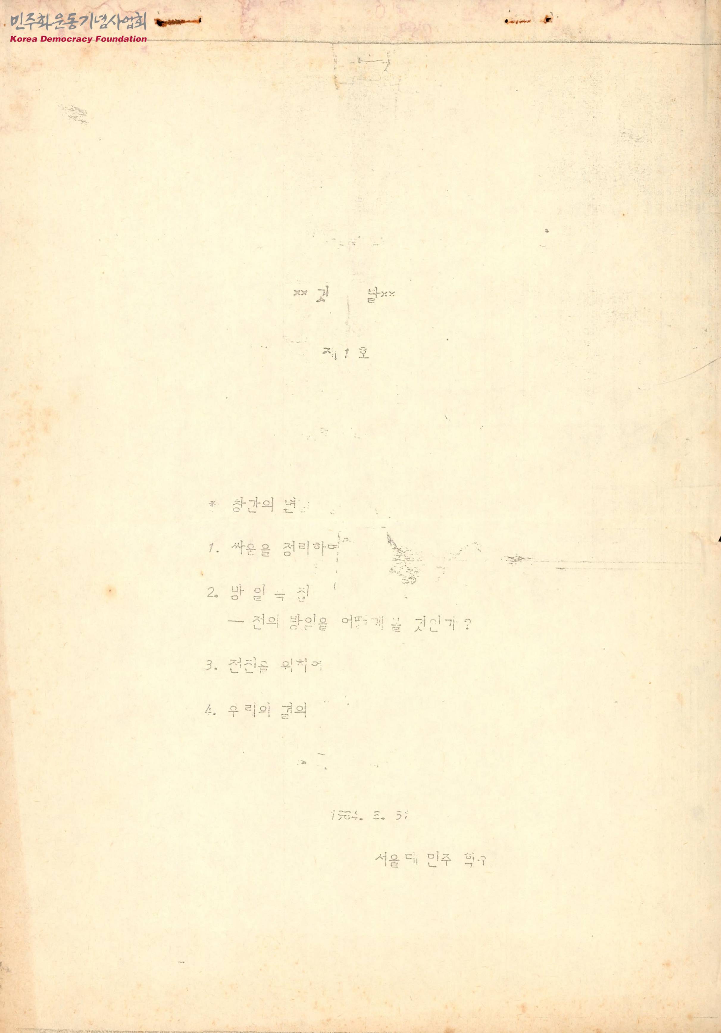 - 전두환의 방일에 대한 의도와 의미를 분석한 글 등이 실린 정간물의 원고로 아래와 같은 목차로 구성되어 있음 -창간의 변 -싸움을 정리하며 -방일특집 전의 방일을 어떻게 볼 것인가? -전진을 위하여 -우리의 결의