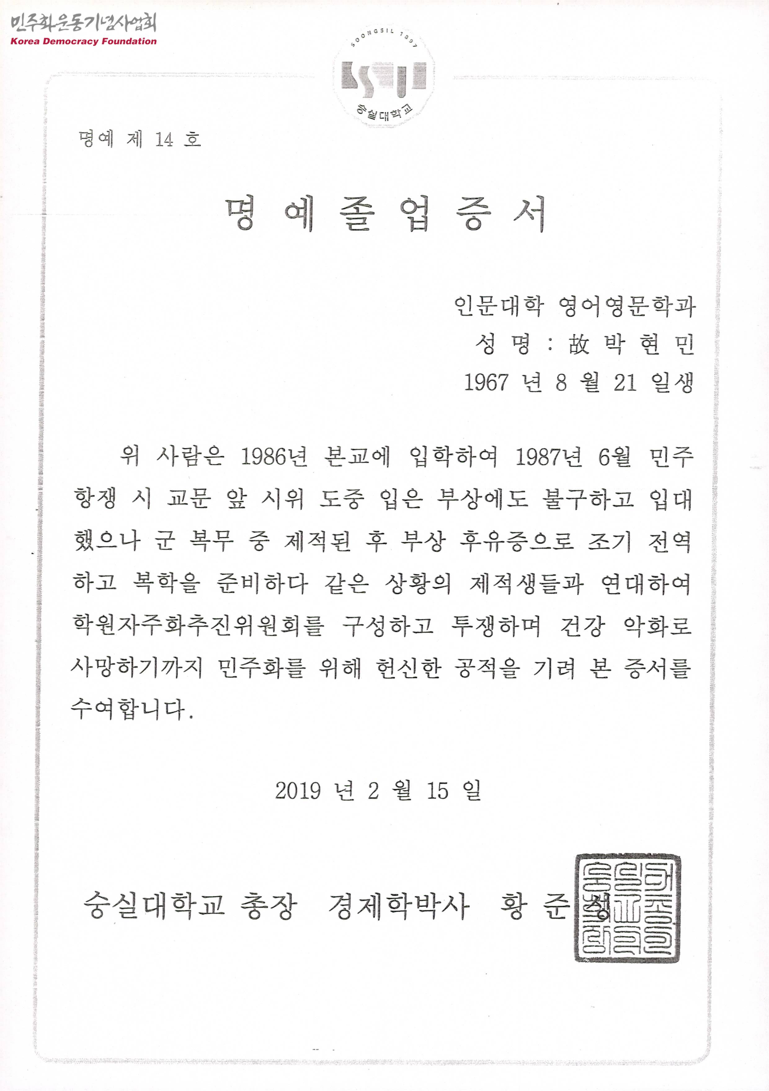- 민주화를 위해 투쟁한 박현민의 공적을 기려 수여된 명예졸업증서의 사본
