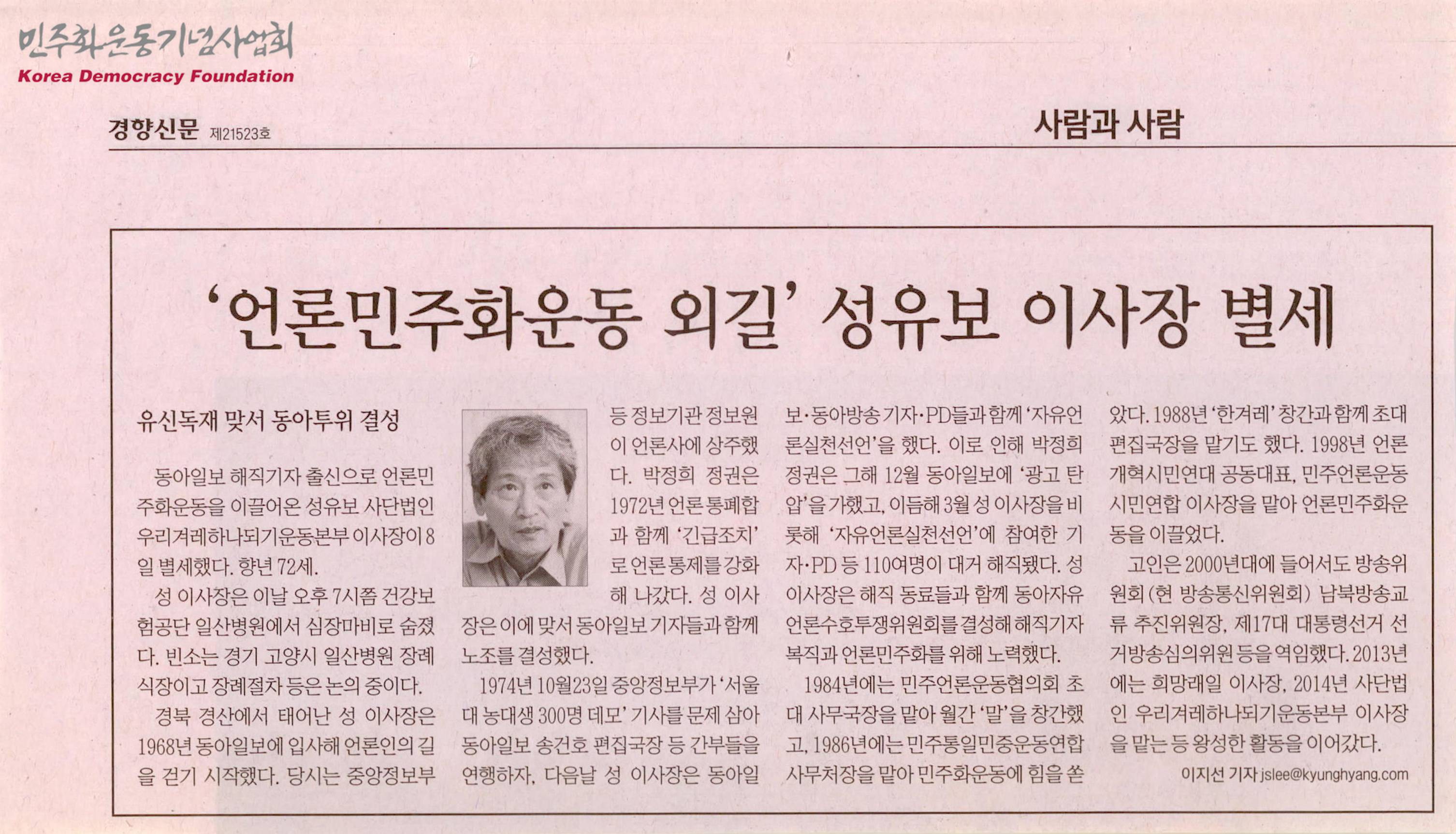 [신문스크랩]'언론민주화운동 외길' 성유보 이사장 별세