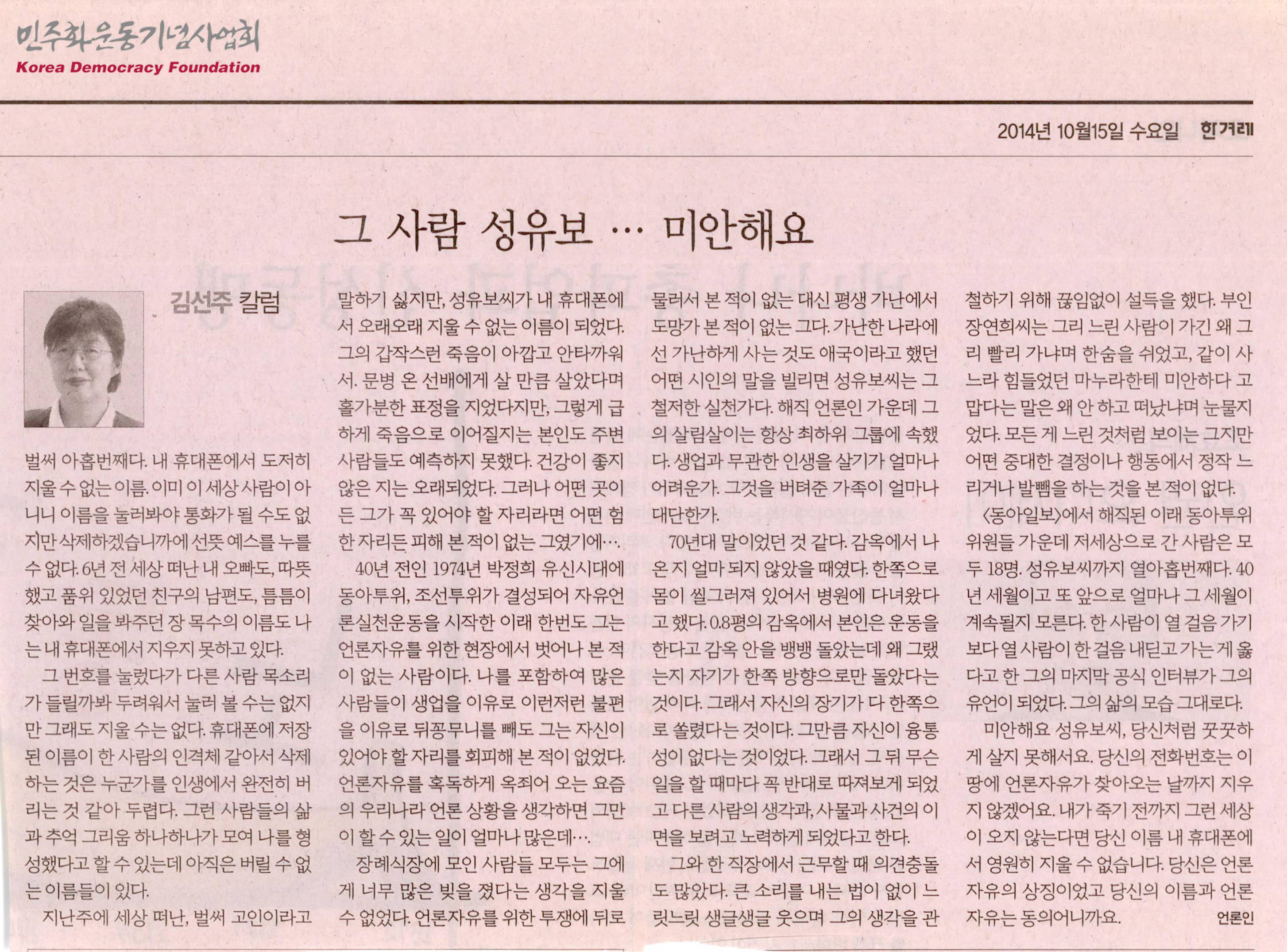 - 언론투쟁을 통해 가난하지만 물러섬이 없는 삶을 살았고 항상 필요한 자리에 있었던 성유보를 추모하며 꿋꿋하게 살지 못해 미안하다는 내용 등이 적힌 신문스크랩
