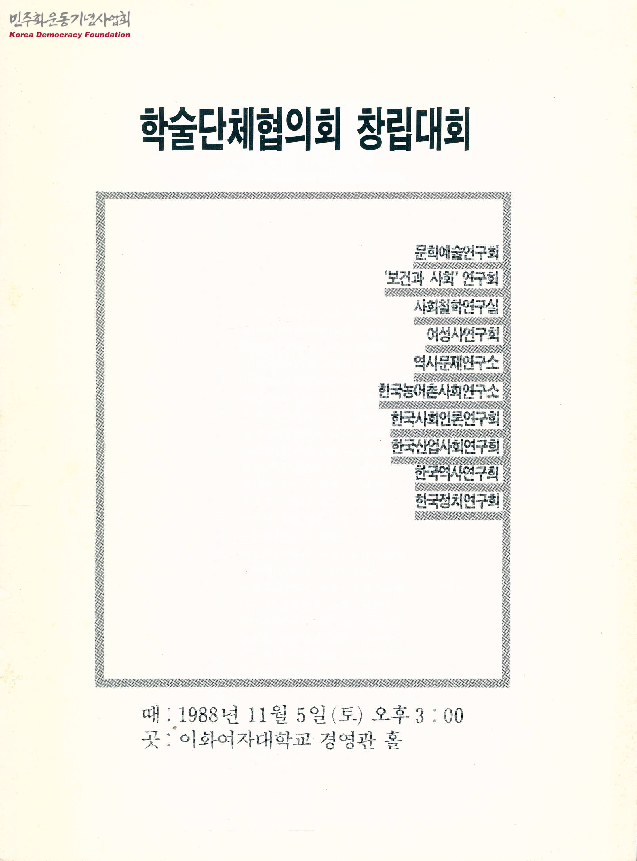 - 이화여자대학교 경영관 홀에서 열린 학물의 올바른 좌표를 찾기 위한 학술단체협의회 창립대회 자료집으로 목차는 다음과 같음 1. 창립대회 식순 2. 경과보고 3. 창립선언문 4. 정관 5. 협의회 임원 소개 6. 회원단체소개 7. 기금안내