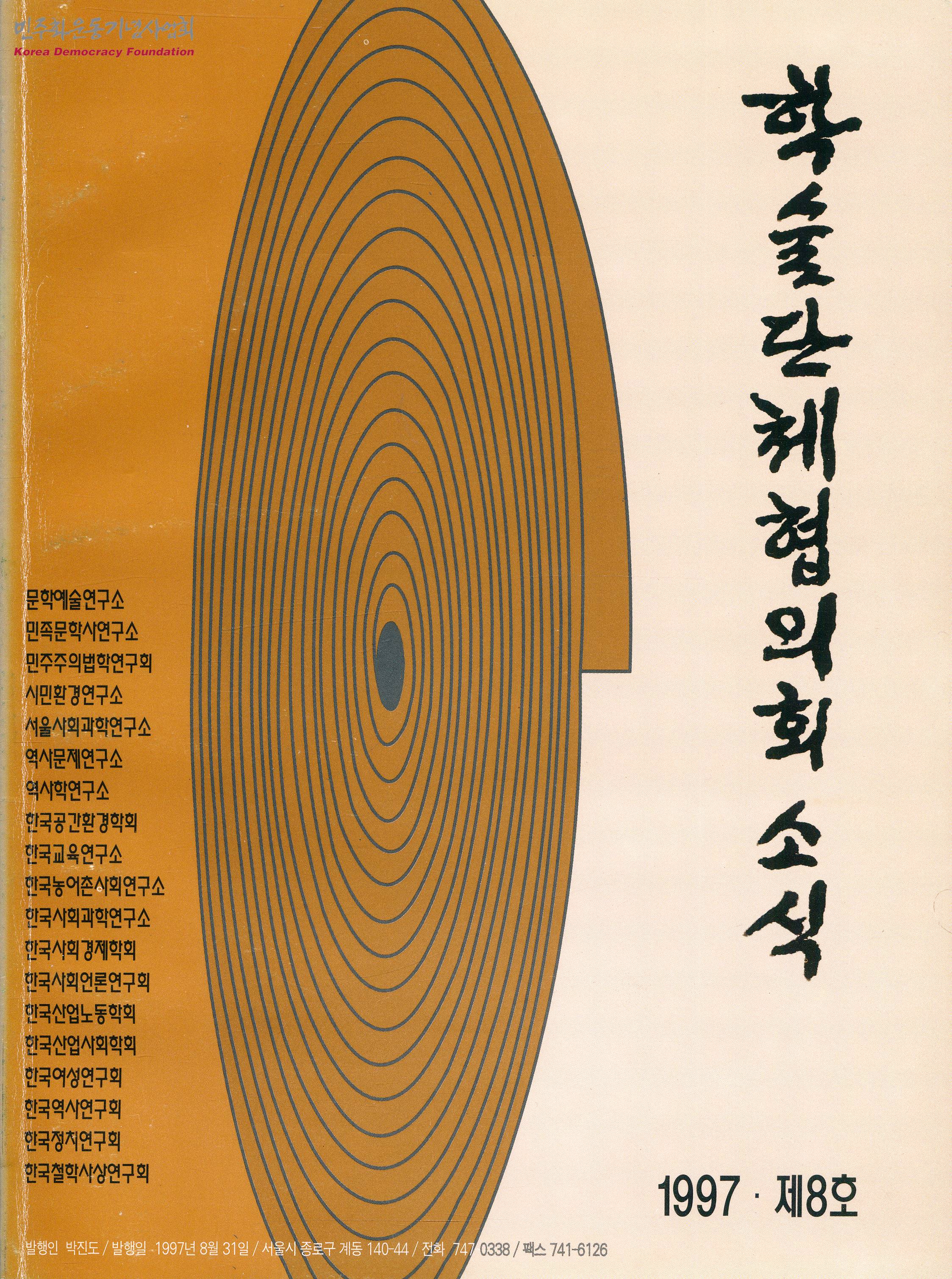- 21세기를 앞두고 진보진영의 장기적 비전과 구체적 실천 프로그램의 개발에 노력하기 위해 발간한 소식지 8호로 목차는 다음과 같음 -학술단체협의회 활동 -회원단체 활동 -평가보고 -학술대회 참관기 -연구동향 -정보통신란 -한상권교수와 함께